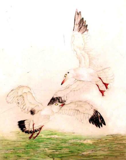 步骤三::朱砂染红嘴鸥喙、爪。藤黄罩染眼睛,使之成为绿色。草绿进一步分染红嘴鸥周身翎毛。淡墨染红嘴鸥初级飞羽及耳羽。草绿染水。