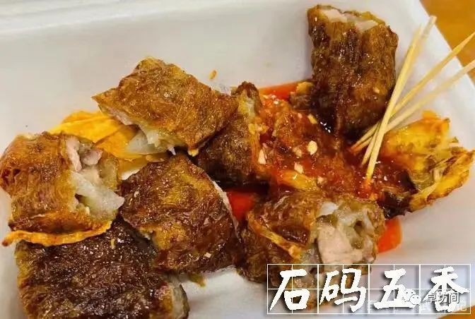 我在厦门八市吃过的石码五香,那也是闽南「鸡卷」的一种。「鸡卷」,是闽台对五香卷的统称,但做法因地而异。虽叫鸡卷,但与鸡没有半毛关系,主要的食材是豆皮或者腐竹包着加马蹄等物的肉泥。但更懂吃的人说,那层皮是用一种闽南话的「网纱」的猪内脏做成的。