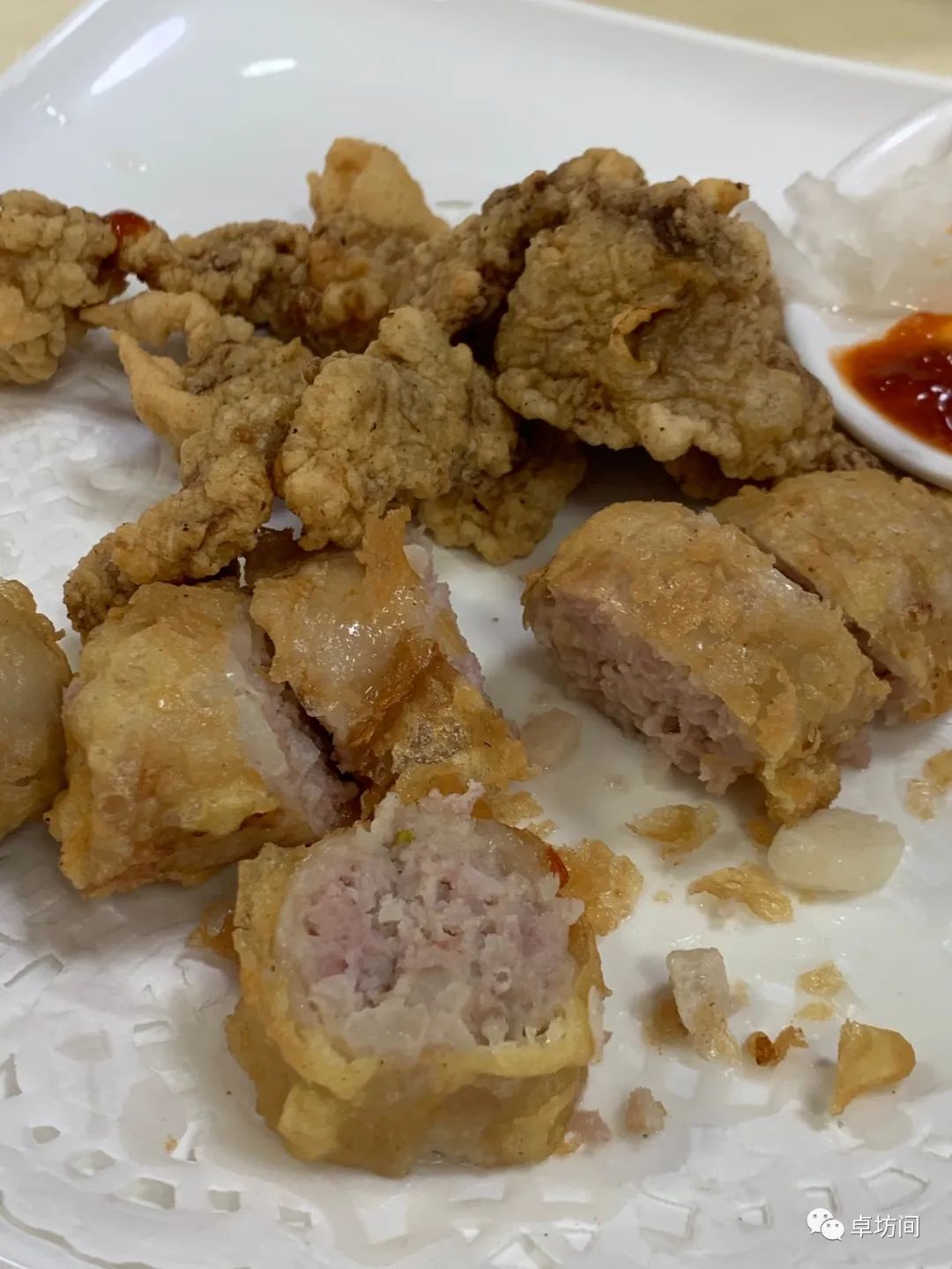 在这里醋肉和鸡卷都没有家乡味的焦红,反而吃出反传统的感觉。醋肉很酥脆,瘦肉炸过老往往咬不烂,它似乎没有这个问题;鸡卷内含马蹄,平添了香脆感。两者间,我更想为后者点赞。