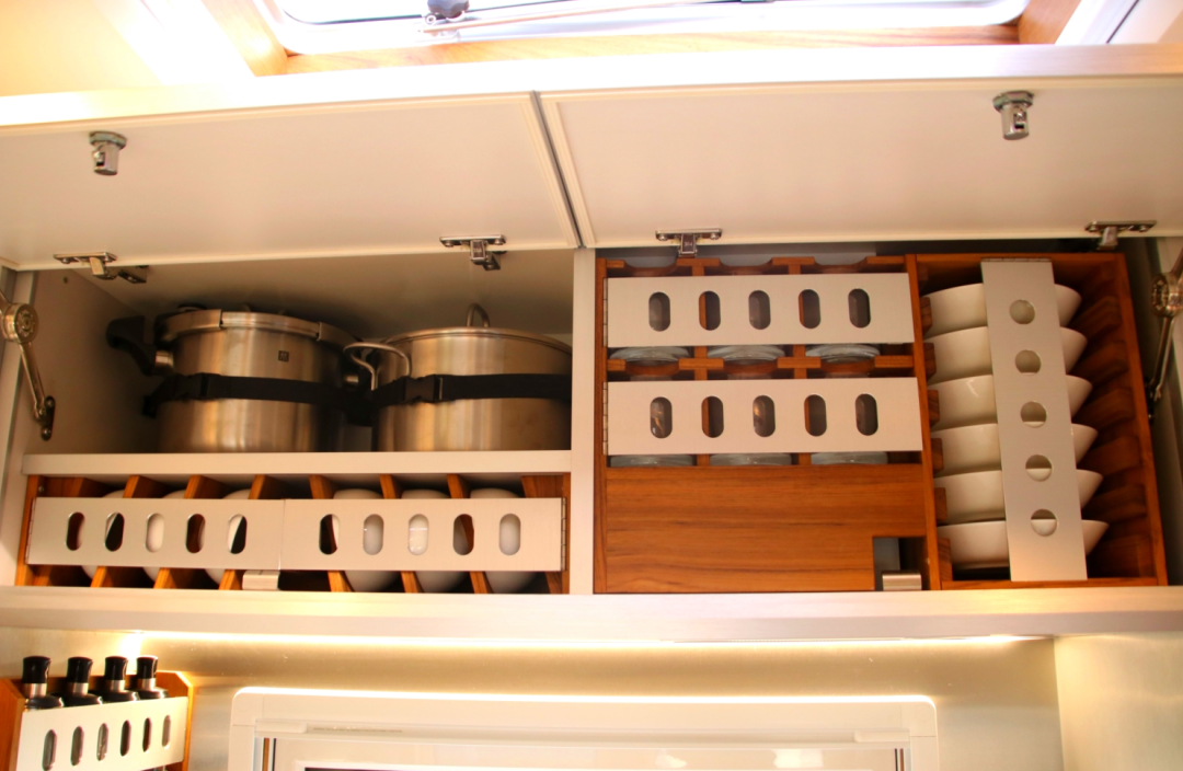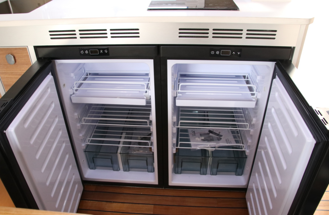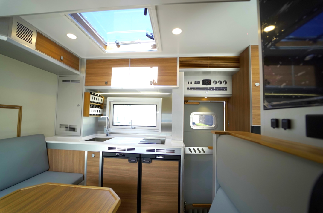 车内大部分大空间分给了前端的客厅和厨房,厨房厨具全部来自德国进口,定制152L分体嵌入式冰箱,存储量更大更方便。2100W电磁炉、油烟机、嵌入式蒸烤一体箱,制作美食更加轻松,食物更加美味。车内设计多处储物柜,大大增加了车内的储物空间。