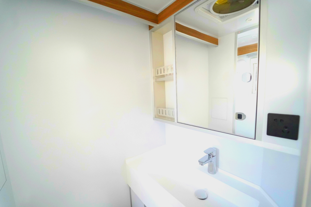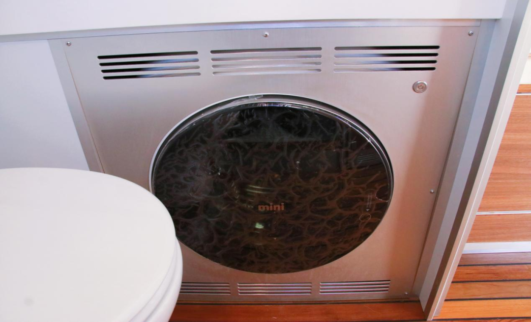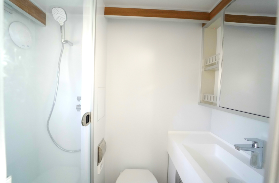 尾部的卫浴间采用干湿分离设计,独立空间,互不打扰。韩国进口嵌入式全自动滚筒洗衣机,无需动手让衣物焕然一新。德国进口自动恒温混水器及花洒,带雨水感应的无线遥控双向通风换气扇、PTC空气加热系统,给您带来更加舒适的沐浴体验。