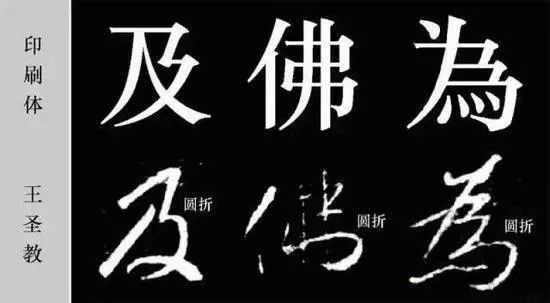 宋体印刷字中有重折时,一律用方折;《圣教序》则不然,上方下圆是最理想最美观的组合。举例如下: