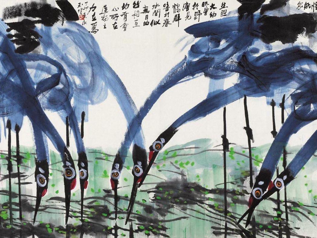 春意闹图。一九八七年冬日,得怪纸,忽然胆大,幼时曾于野溏见鹤群嘻于春水间,似无目的,然相互均有会心所在,造物之力在焉。丁卯黄永玉作。 钤印:黄永玉。