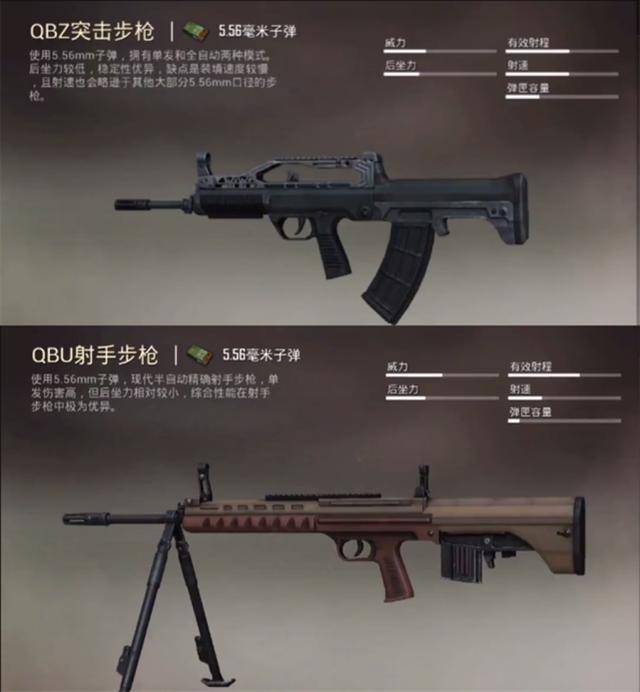 这两款步枪在雨林模式中是最常见的,具体都有哪些技能呢,今天小编就带大家一起来看一下。这两款枪的作用。作为一款突击步枪QBZ能实现连射的功能并且携带5.56子弹,如果能正确的找到合适的开枪方式就能打出这款枪的最大伤害,从而在战场上实现完美的击杀效果。而QBU作为一款射手步枪它的射程要远一些会被玩家当做当成点射狙一样使用。但是弹夹容量低是这把枪的致命缺点。