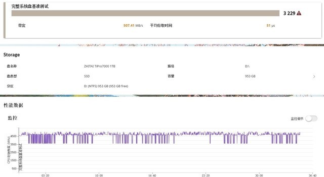 进入PC Mark10完全系统盘测试中,在历经了半小时左右的测试后,可以看到在关键的三个数值上面,带马甲和无马甲的长江存储·致态TiPro7000固态硬盘,还是存在一些性能差异,当然了这些差异会根据测试平台不同,表现各异,这个结果只能从大体上验证,装载了散热马甲后,固态硬盘的性能确实能够相对稳定高效。