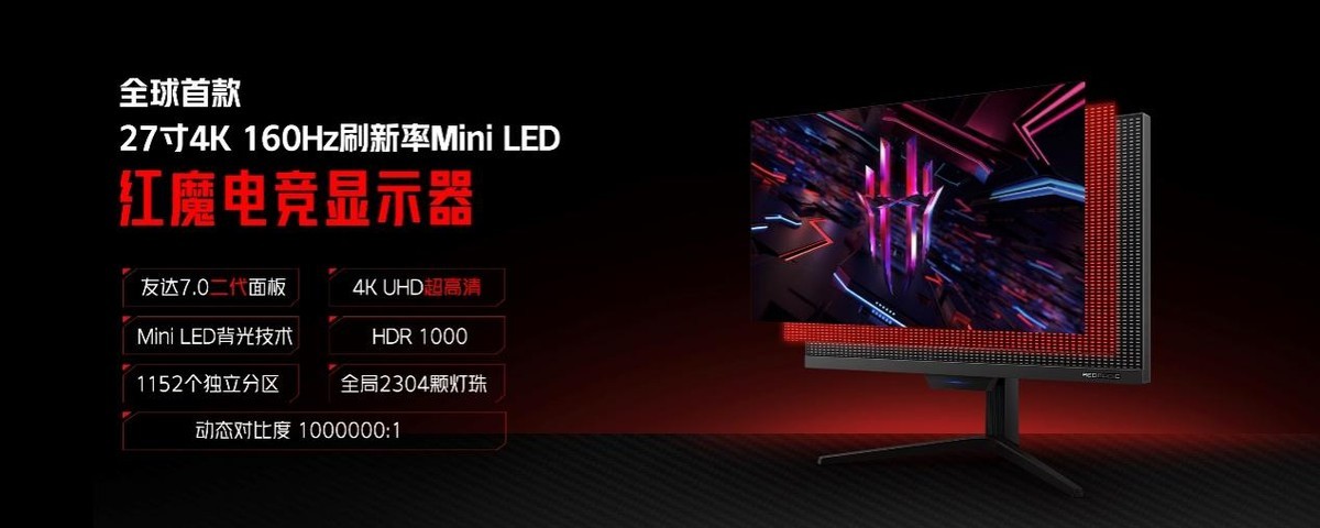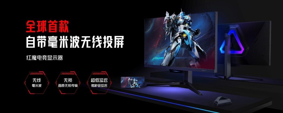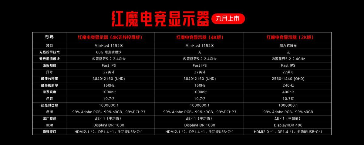 红魔电竞显示器是全行业首款27英寸4K 160Hz MiniLED显示器,同时也是全行业首款自带毫米波无线投屏技术的显示器,搭载27英寸大屏幕,4K UHD超高清分辨率,178°超广视角;作为行业首款友达光电7.0面板的MiniLED显示器,内置多达2304颗MiniLED灯珠,支持1152个独立分区智能分区控光;同时还支持160Hz超高刷新率,兼容AMD FreeSync和NVIDIA G-Sync两大显卡厂商显示变频技术,游戏更极致流畅!全域广色域覆盖精准还原3A大作色彩,完美兼顾游戏与设计创作需求。红魔独家开发的毫米波无线投屏系统,支持无损画质投屏且延迟低至1.7ms,近乎零延迟传输!同时支持手机、Pad、Switch、摄像机、笔记本电脑等多种设备,实现全场景生态的互联互通,带来次世代的投屏体验!除了4K 毫米波投屏版本以外,红魔电竞显示器还有4K 纯享版和支持240Hz极限高刷的2K显示版本供不同需求的玩家自由选择!