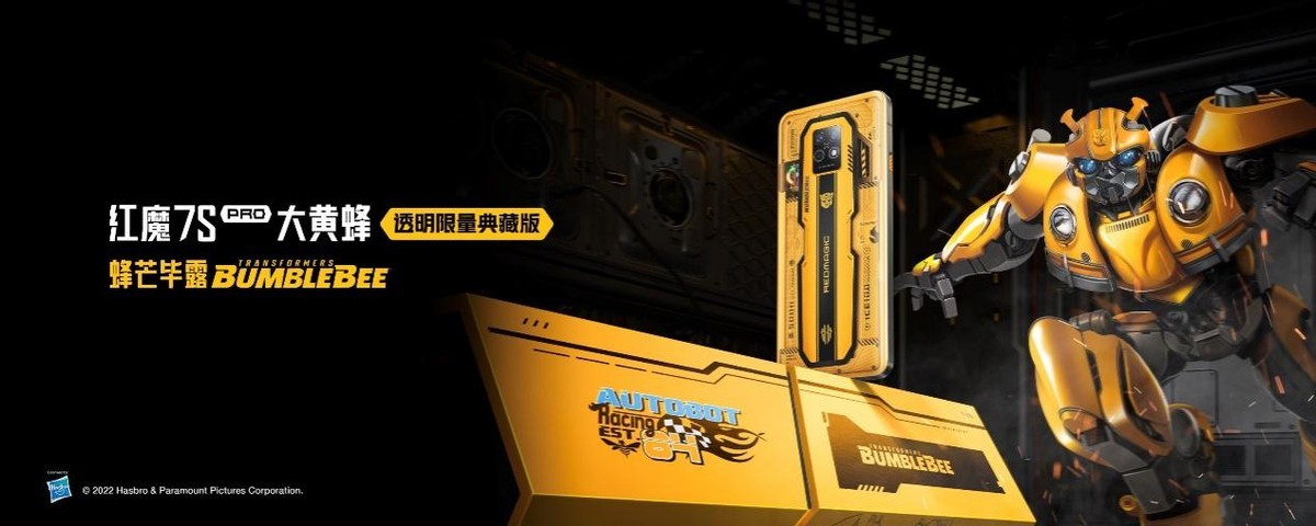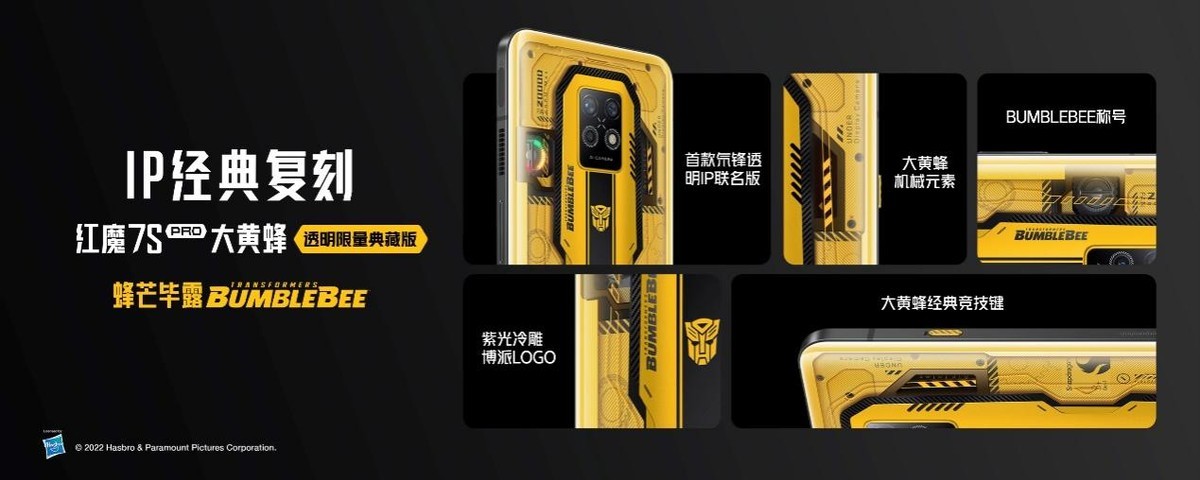 此外更惊喜的是,继上半年红魔推出变形金刚擎天柱与霸天虎信仰套装后,这一次备受铁粉期待的红魔7S Pro变形金刚大黄蜂限量典藏套装也“蜂芒毕露”,重磅登场!打开这套豪华的典藏六边形“蜂窝”礼盒,里面包含了内存配置为16+512GB的红魔7S Pro大黄蜂定制版,大黄蜂定制涡轮散热背夹、165W氮化镓充电器,以及导热保护壳等一整套细节感拉满的定制装备。红魔7S Pro大黄蜂定制版采用经典的黄色与红魔标志性的氘锋透明碰撞融合,采用紫光冷调等行业顶尖工艺,打造红魔首款氘锋透明IP联名版!机身内部包含了丰富的变形金刚机械元素以及大黄蜂特别设计的竞技键,对经典的致敬与用心覆盖到每一处细节,同时内置一套定制主题UI,由内至外呈现最耀眼的大黄蜂战斗姿态!
