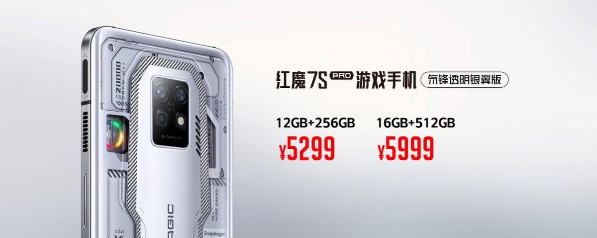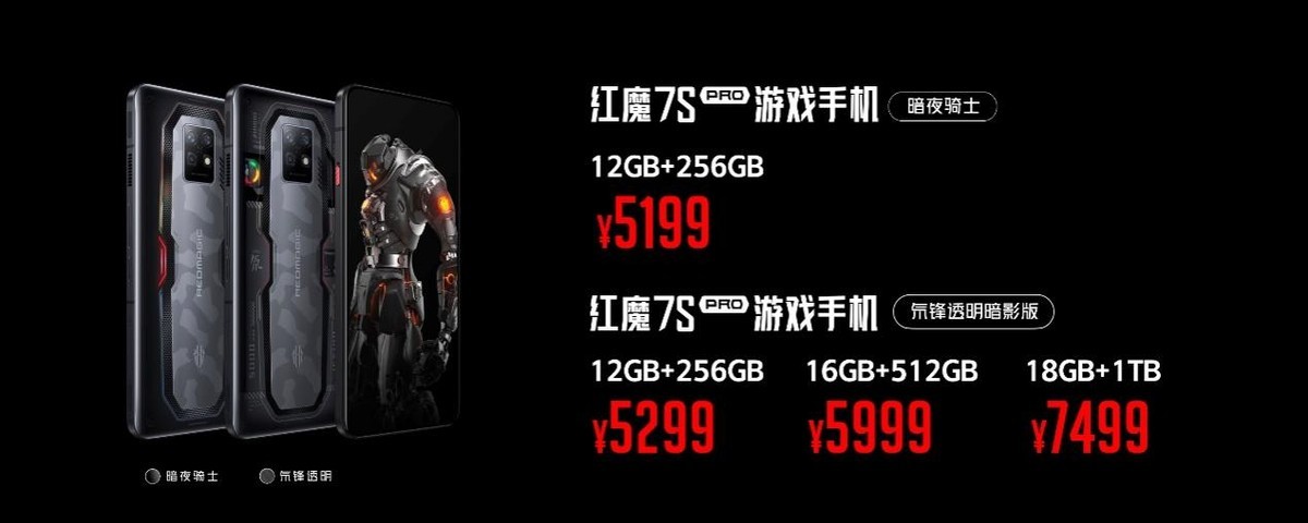 本次红魔7S系列提供了多个存储配置版本,玩家可根据自身需求灵活选择:红魔7S暗夜骑士8+128GB,售价3999元!12+256GB,售价4799元!红魔7S氘锋透明12+128GB,售价4899元!16+256GB,售价5499元!红魔7S Pro暗夜骑士12+256GB,售价5199元!红魔7S Pro氘锋透明暗影版12+256GB,售价5299元!16+512GB,售价5999元!18GB+1TB,售价7499元!挑战行业首款未来科幻风格银色透明设计的红魔7S Pro氘锋透明银翼版,12+256GB售价5299元!16+512GB,售价5999元!掀起红魔“蜂”潮的变形金刚大黄蜂限量典藏套装,售价6499元,将于7月底开售!