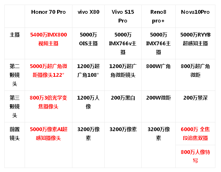 除主摄外,其他镜头的表现也值得考量。刚发布的华为nova 10 Pro使用了800万超广角微距镜头和200万景深镜头,OPPO Reno 8 Pro+使用了类似的800万超广角镜头和200万微距镜头,这样的数据略有凑数之嫌。而vivo S15 Pro稍好,超广角微距镜头为1200万像素,另搭配了一颗200万黑白像素镜头。表现最好的荣耀70 Pro配备了主摄级别的5000万超广角微距镜头,还有同档位比较罕见的800万长焦镜头,并支持OIS与EIS双防抖,可以说诚意十足,保证了较高水平的影像规格。