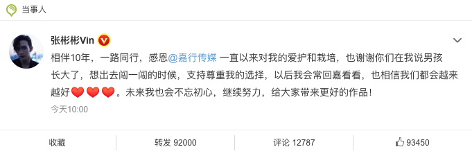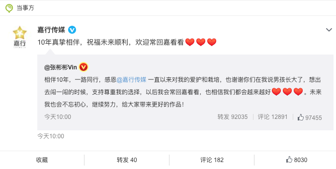 而在张彬彬发文告别嘉行后,嘉行也转发了张彬彬这条动态,并发声祝福。「祝福未来顺利,欢迎常回嘉看看」。而且两者就是前后脚发布,从这看得出来曾经的老板对张彬彬的离开还是选择祝福的,并没有因为他红了就不再续约而生气。不过,这也正常,像他们没有红过脸的合作,还是好聚好散为好,说不定哪天又有机会合作了。