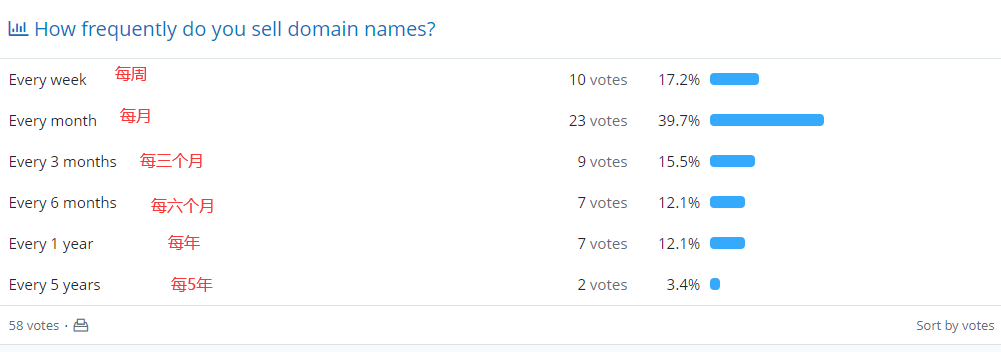 虽然参与的人数不多,但却也不难看出,其中每个月都有出售域名的比例还是相当大的,其次就是每周,再者三个月、六个月、一年……先不论这些域名的价格如何,盈利几许,至少也有一定的规律和道理潜藏其中。