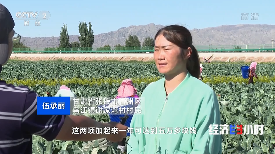甘肃省张掖市甘州区乌江镇谢家湾村村民 伍承丽:“现在收入有两项,一是固定的土地流转金加我空闲时间出来,来这蔬菜基地打工的收入,这两项加起来一年可达到五万多块钱。”