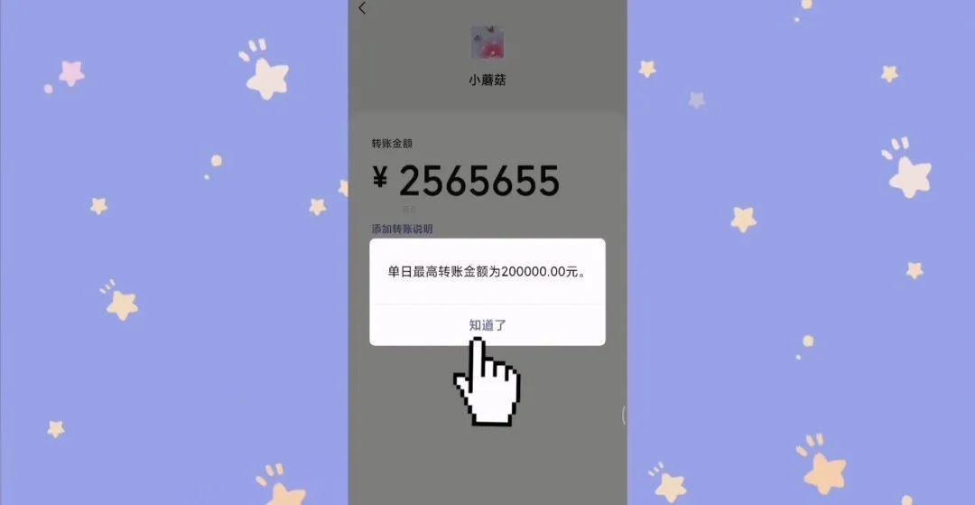 在这里我们点击转账功能。在这里我们随便输入数字。在这里我们看到当日最高转账金额为二十万元。就是说我们转账的最大额度是二十万元。这是金额方面的一个区别。