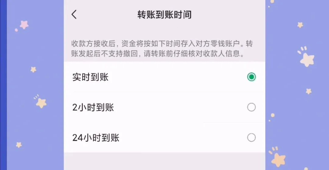 我们看到在下方有一个转账到账时间,我们点击一下。在这里有三个选择,实时到账,两小时到账,二十四小时到账。我们就根据自己的一个需要来选择。