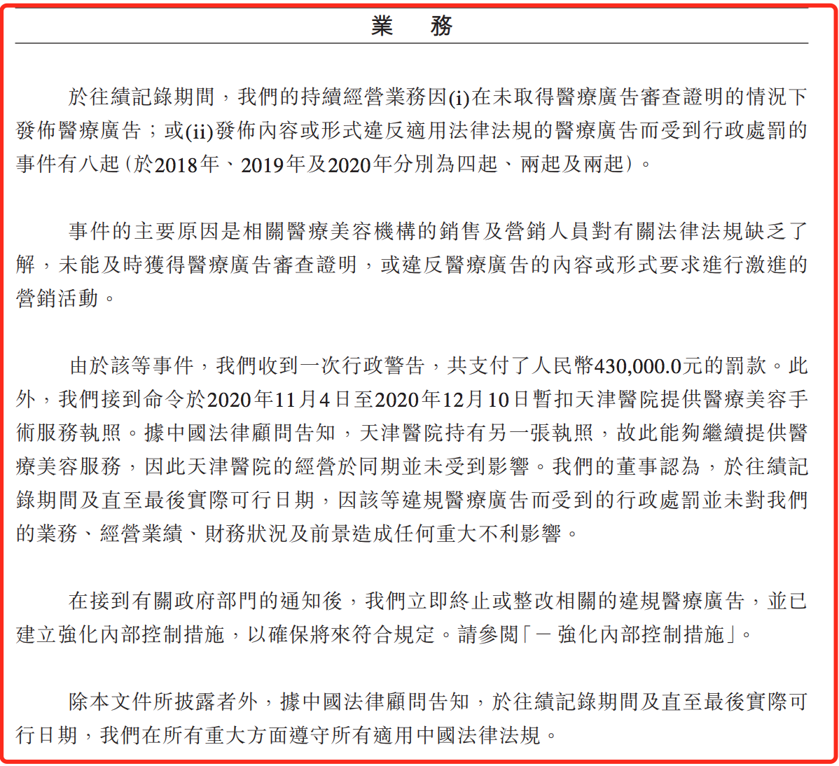 伊美尔在其招股书中介绍称,其于往绩记录期间的持续经营业务因在未取得医疗广告审查证明的情况下发布医疗广告;或发布内容或形式违反适用法律法规的医疗广告而受到行政处罚的事件有8起。