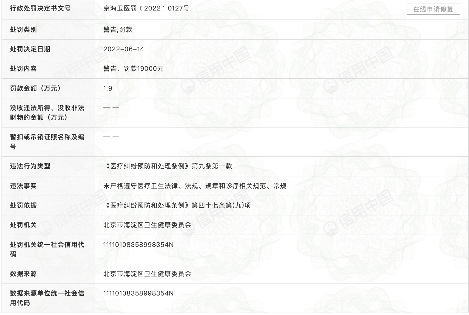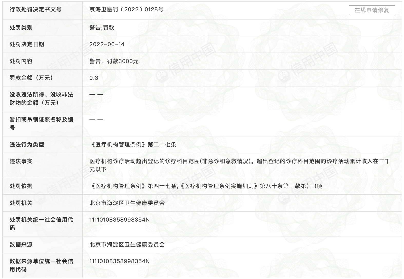 而京海卫医罚〔2022〕0128号行政处罚信息则显示,伊美尔长岛因医疗机构诊疗活动超出登记的诊疗科目范围(非急诊和急救情况),被北京市海淀区卫生健康委员会处以警告、罚款3000元。