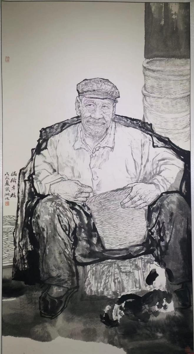 作品讲述:画家在农村采风时,发现一位老人在认真地编织竹筐子,那粗糙的双手编织着一家人的经济来源、编织着美好的未来生活。画家触景生情,提笔以写意泼墨技法记录了下来。