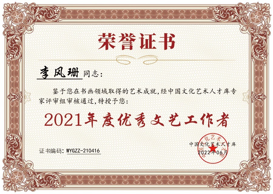 鉴于李风珊先生在书画领域取得的优异成就,经中国文化艺术人才库专家评审组审核通过,授予其“2021年度优秀文艺工作者”荣誉称号。