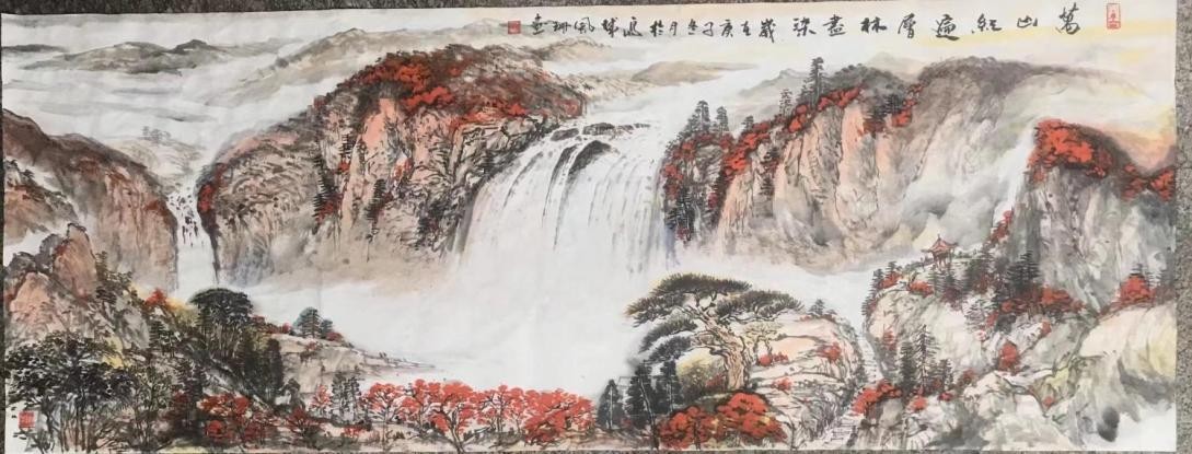 作品讲述:画家以艺术勾、皴、点、染等中国画技法来描绘毛泽东词作《沁园春·长沙》中的名句“看万山红遍,层林尽染”,描述了深秋时分、湘江之滨的岳麓山漫山古树皆红的壮丽风景。
