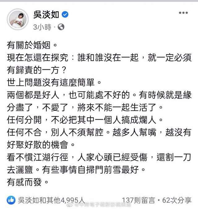 随后,作家吴淡如也发文,表示:“有时候就是缘分尽了,不爱了,将来不能一起生活了。”还奉劝双方好友别帮腔了,越多人出来说话,越没有好聚好散的机会。