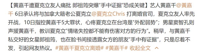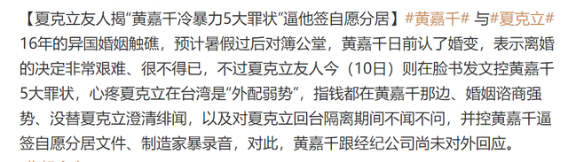 那边,夏克立的好友也发声,控诉黄嘉千5大罪状,称夏克立在台湾是属于“外配弱势”,家里的钱由黄嘉千保管,出绯闻不替男方澄清,婚姻出现问题做法强势,对夏克立冷暴力,以及对夏克立回台隔离期间不闻不问,并控黄嘉千逼签自愿分居文件、制造家暴录音。直指黄嘉千是心机女。