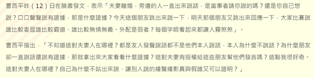 先是男星曹西平发文,吐槽双方好友没完没了:“夫妻离婚,旁边的人一直出来说话,是当事者请你说的吗?”