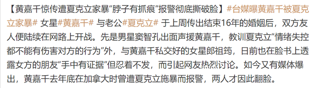 而黄嘉千这边的好友自然是看不下去,出面反驳并怒斥夏克立家暴,女方脖子上还有抓痕,称黄嘉千“手中有证据”只是忍着不发,接着又有媒体曝出,黄嘉千去年底在加拿大时曾遭夏克立施暴而报警,两人才因此翻脸。