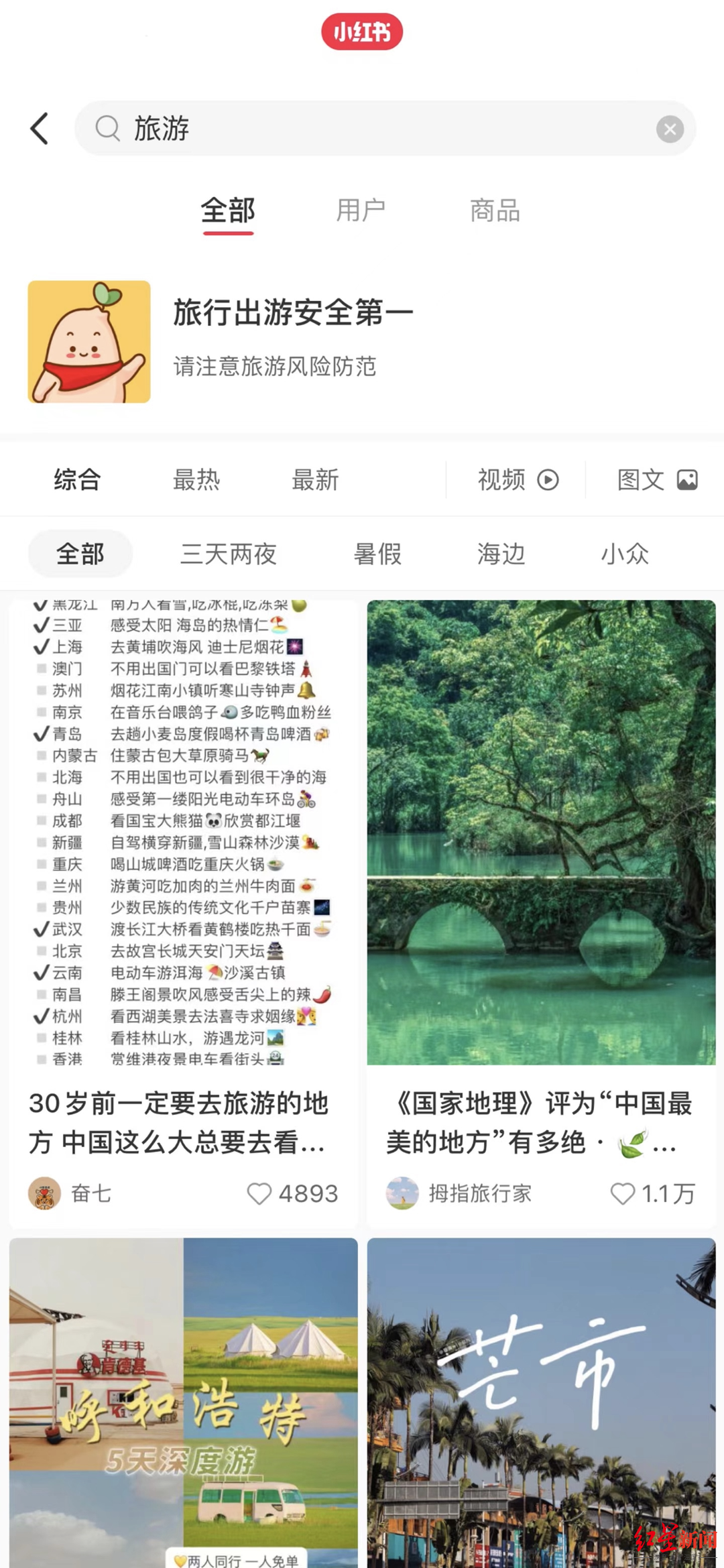 小红书搜索“旅游”页面截图