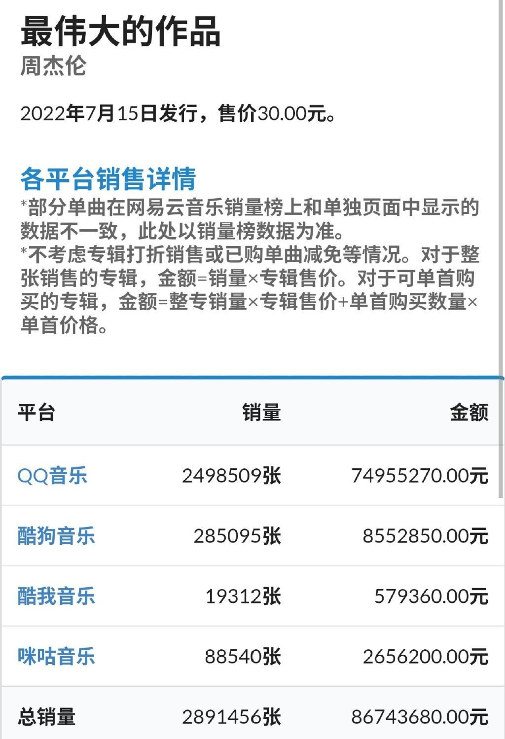 虽然周杰伦的新专辑被众多网友吐槽,但是他的新专辑销量却是一直在攀升,据了解,该新专辑仅只发了一首先行曲,目前预售已近300万张,销售额已达8674万,相信破亿也是很容易的了。