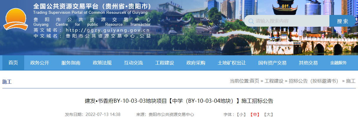 乐居新媒体 贵阳讯7月13日,贵阳市公共资源交易中心发布建发·书香府BY-10-03-03地块项目【中学(BY-10-03-04地块)】施工招标公告。