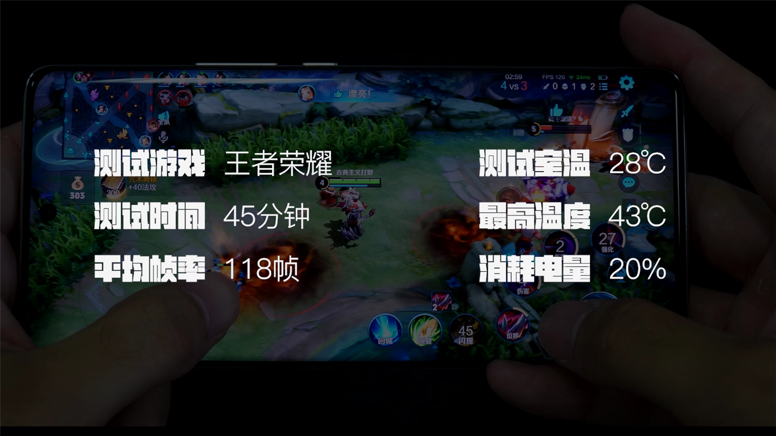 性能方面,简单聊一下王者荣耀的测试数据,测试时间为45分钟,平均帧率118,机身最高温度为43度(室温28度),掉电20%。