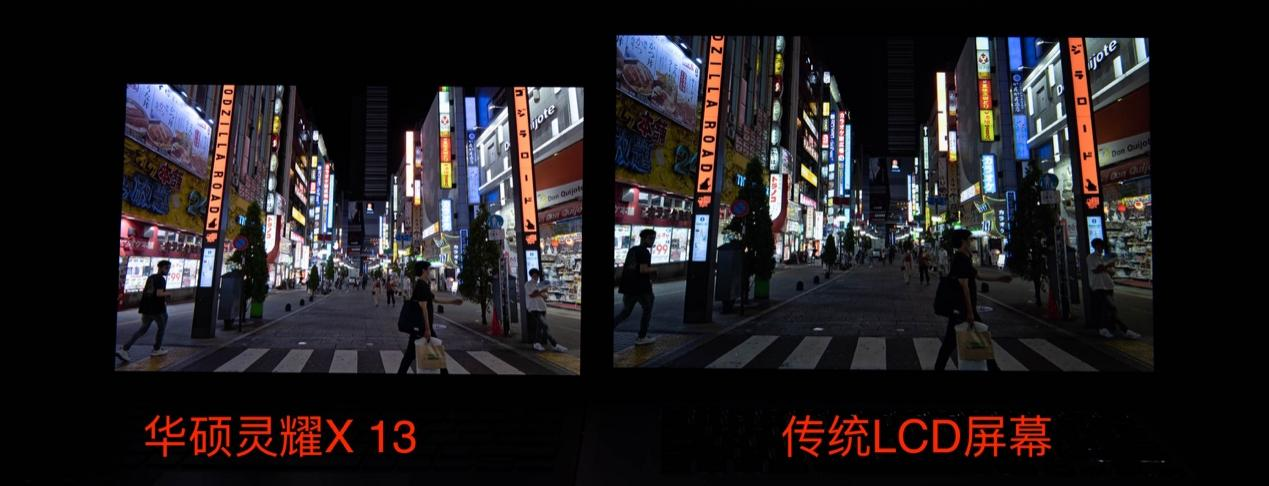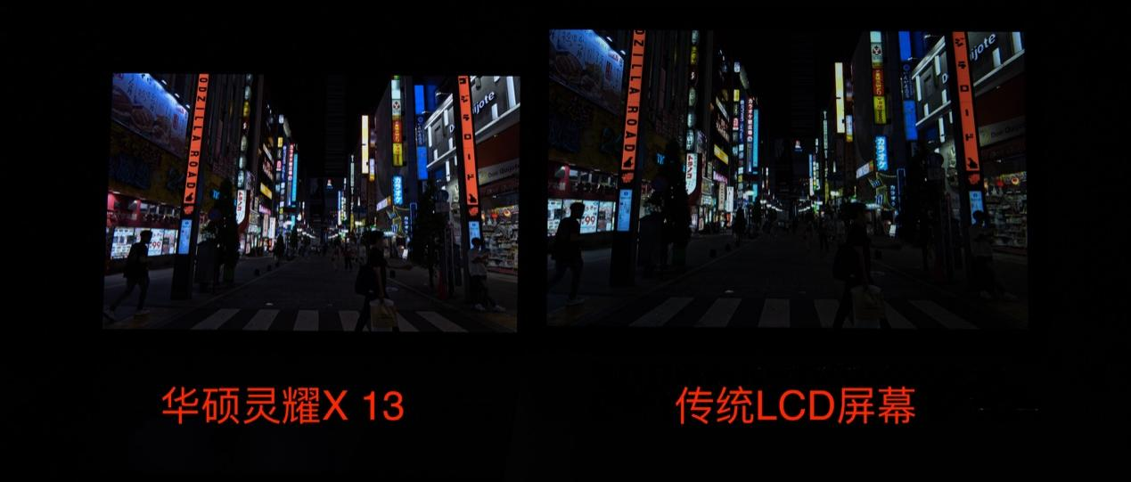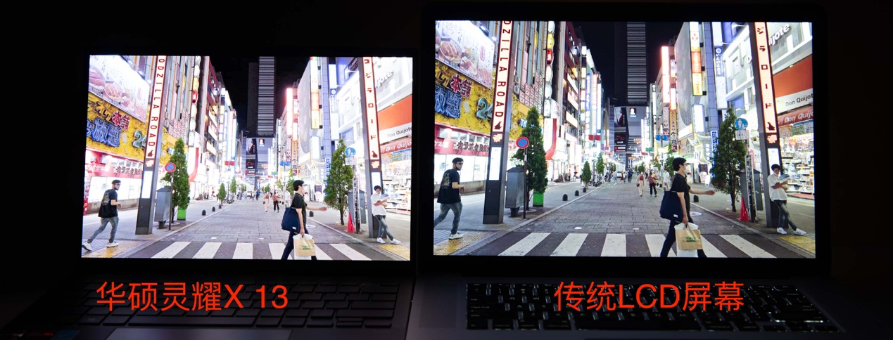 因为相机的宽容度远低于人眼,所以我通过三组照片来进行对比,从图中可以明显看出,过度曝光时传统LCD屏幕天空暗部明显发灰,而灵耀X 13的天空则黑的更纯粹。曝光不足时主要看暗部的细节,可以明显看到灵耀X 13画面中的斑马线、手提袋以及路边暗部广告牌,都要比传统LCD屏幕细节更多一些。