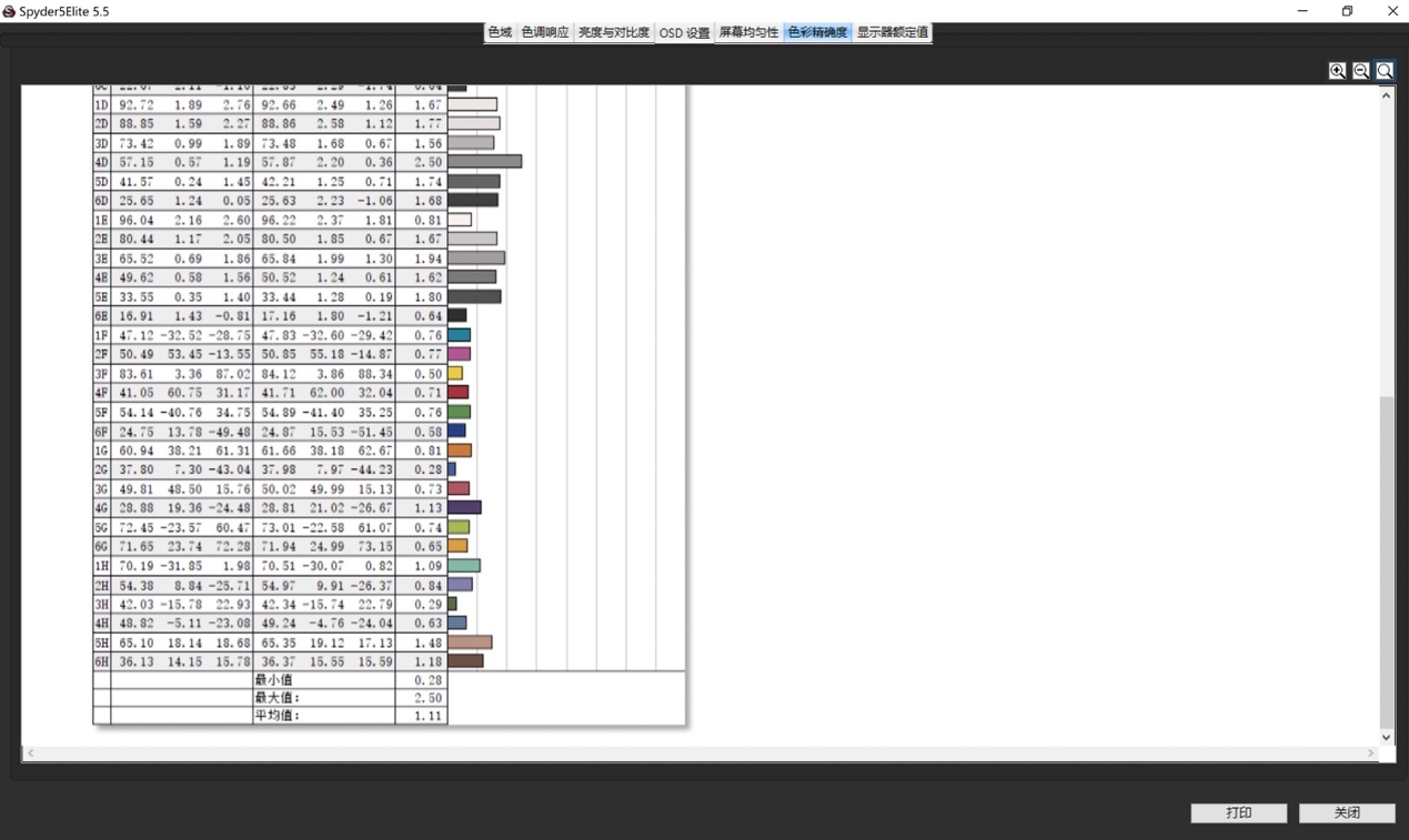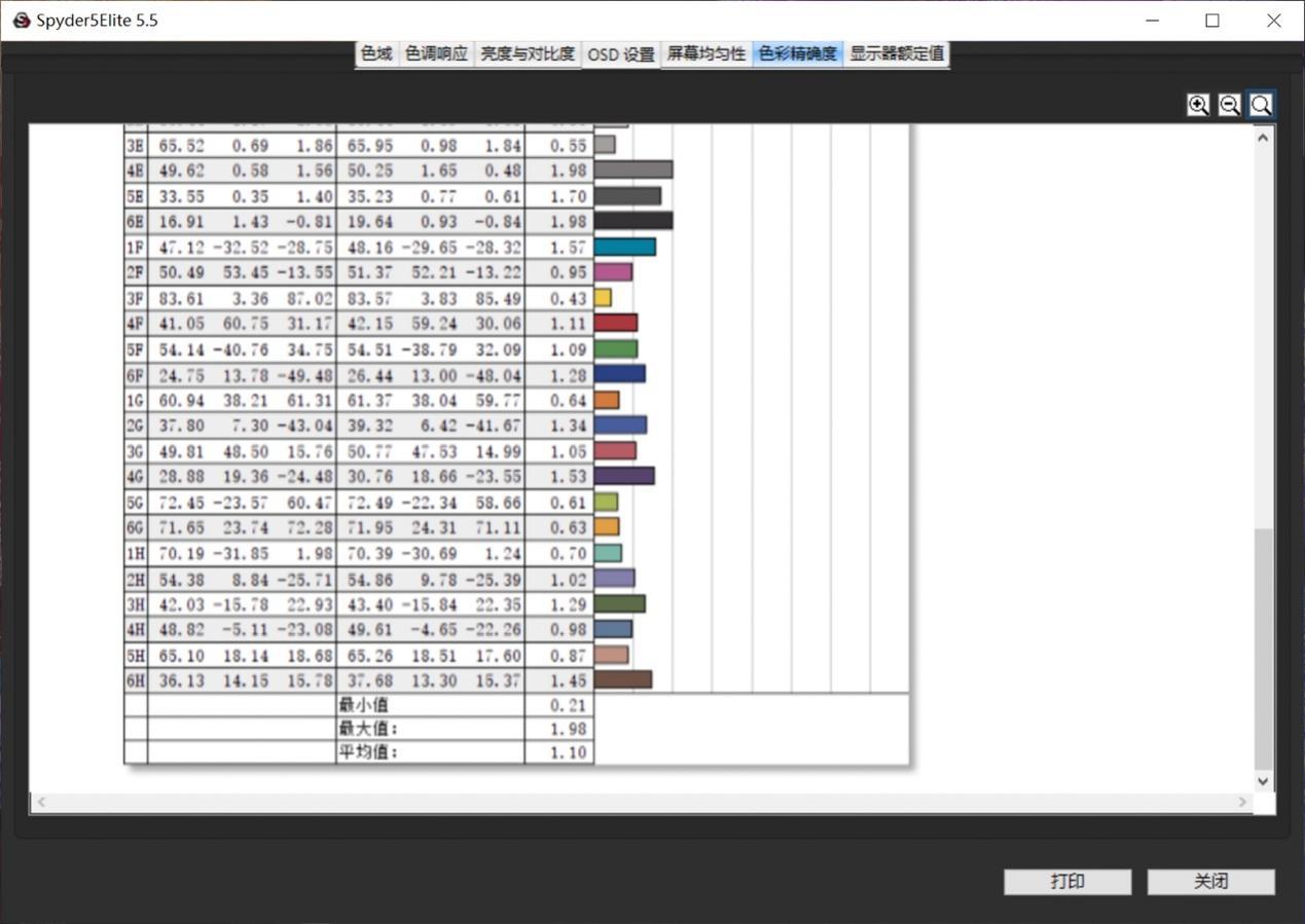 在sRGB色域模式下测得Delta-e平均值为1.1,其中最大值也仅有2.5。