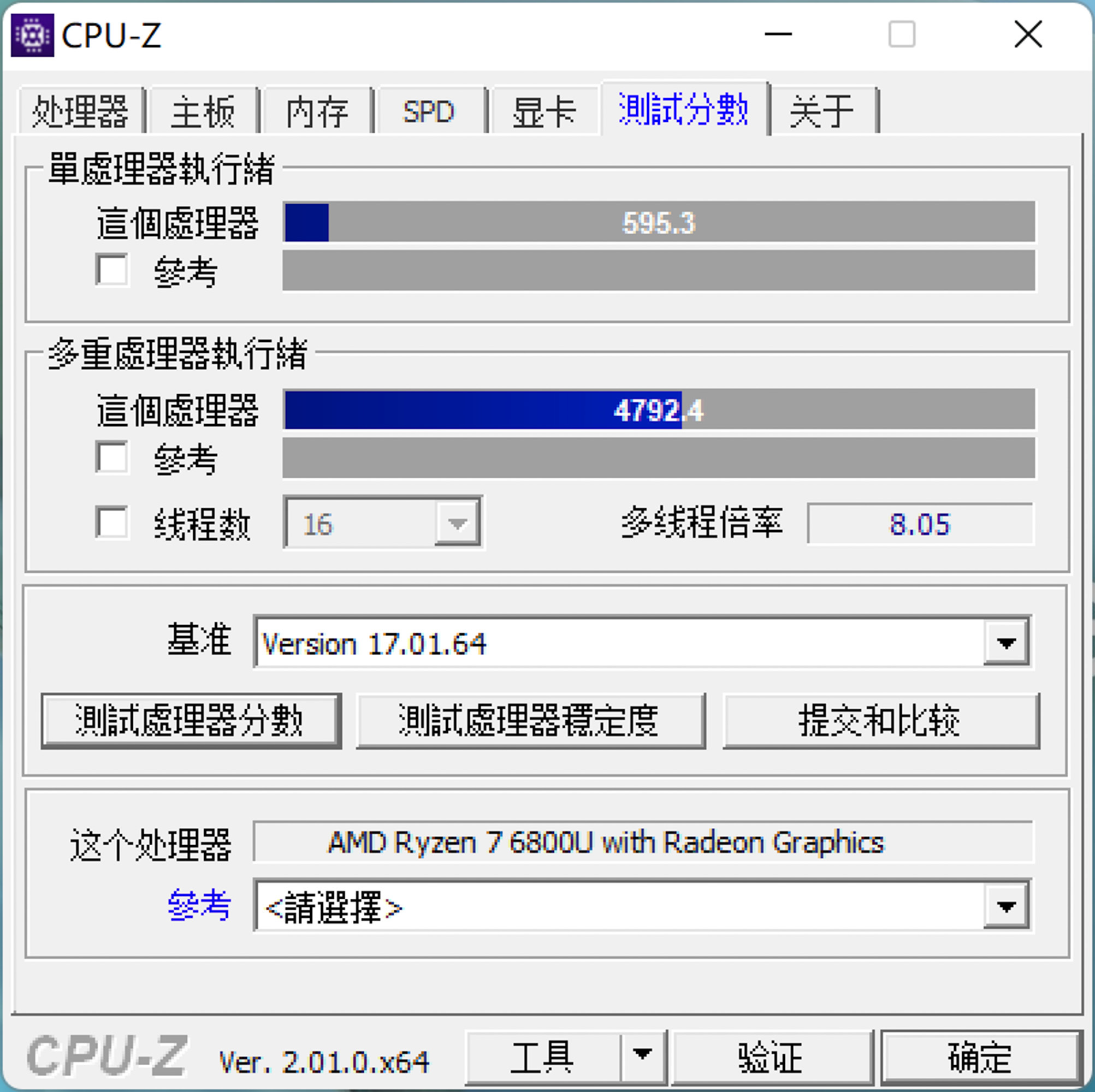 使用CPU-Z对灵耀X 13进行了一个简单测试,单核得分595.3,多核得分4792.4。