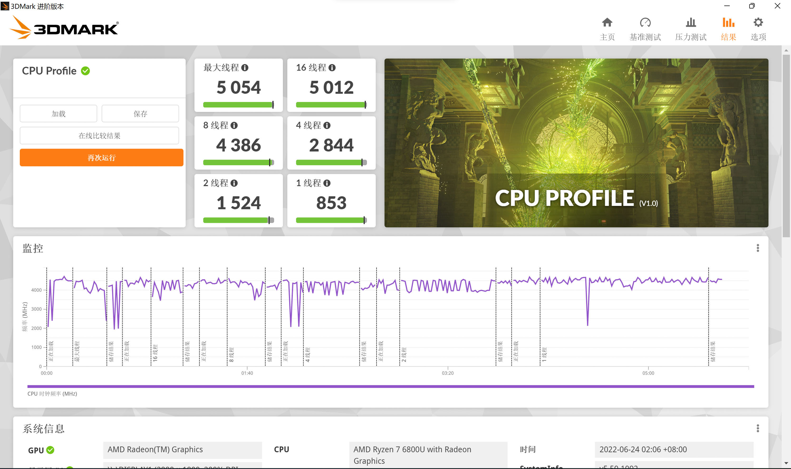 使用3D Mark对CPU进行综合测试,DX9游戏主要看4线程/2线程成绩,DX12游戏则与8线程关系比较大,对于这款轻薄本的日常使用用途来看,主要看16线程的成绩,因为关系到密集计算,多程序运行。