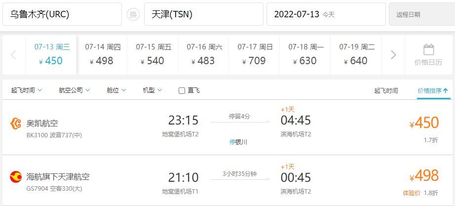 仍以乌鲁木齐为例,虽然它现在返回各大城市的机票特别贵,但是今明两天到天津只需要400多元。价格近三天内“越来越便宜”,说明上座率其实并不高。