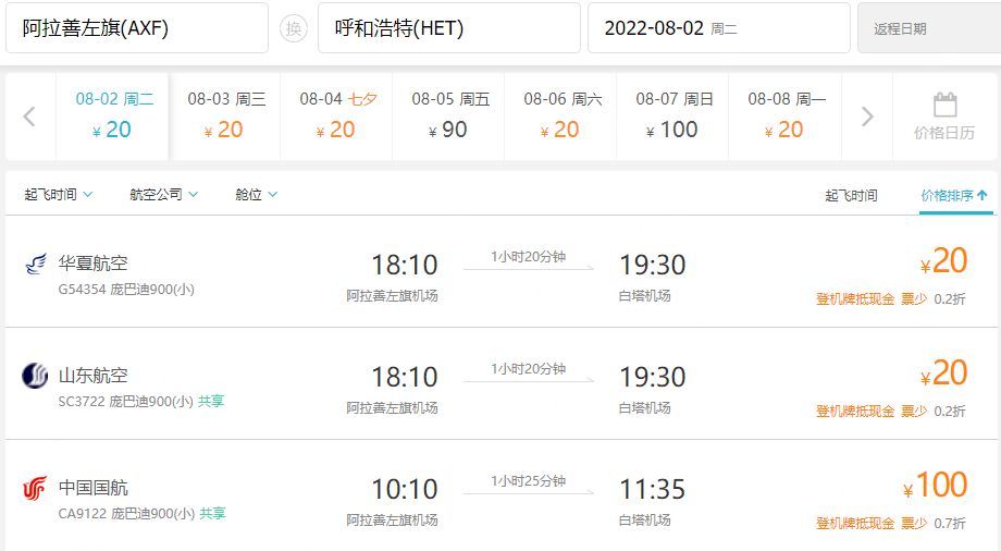让我们还是按“价格”进行本次分析。本次“国内最便宜”属于“阿拉善左旗=呼和浩特”,华夏航空抛出了20元的低价(裸价),多个日子往返都有——暑期能这么低,非常罕见!