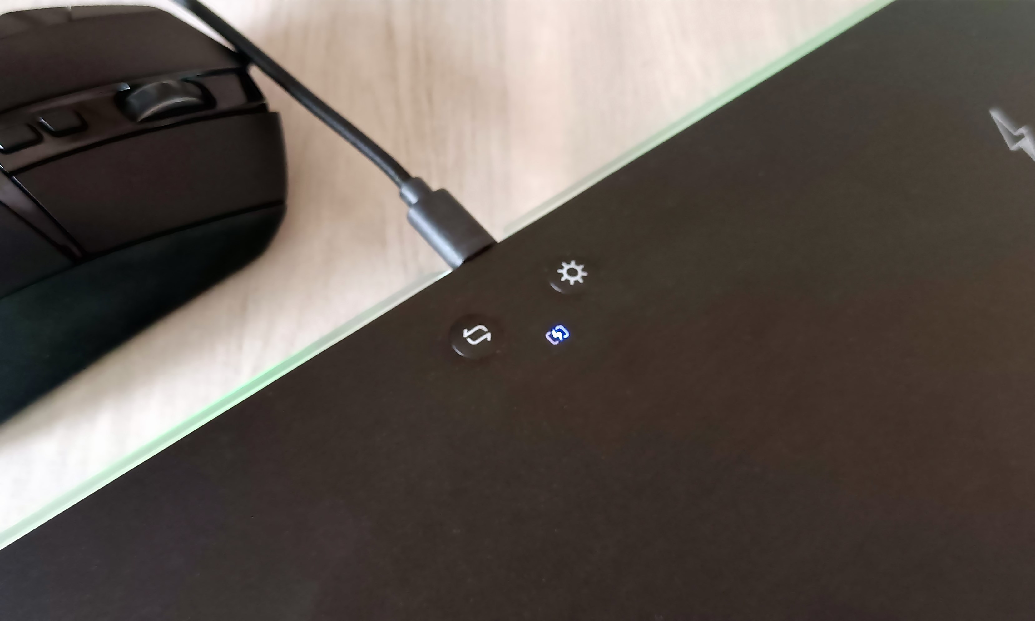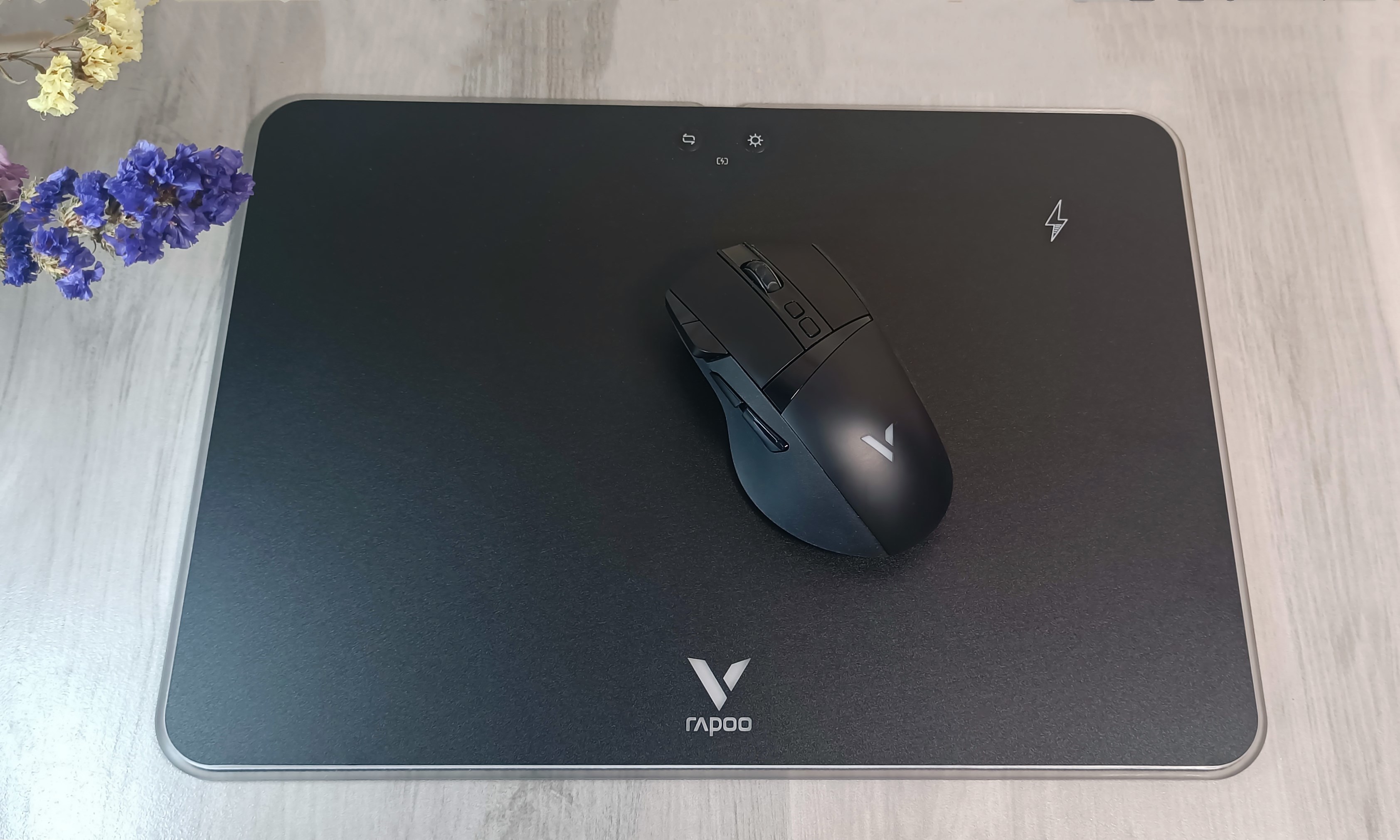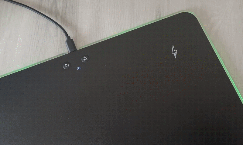 鼠标垫正前方有两个按键和一个LED指示灯,左边按键为灯光模式控制键,轻按可在光谱循环模式、幻彩模式、单色呼吸模式和单色常亮模式间切换;右边按键为亮度调节键,可实现(强、中、弱、关闭)四档亮度调节。另外,鼠标垫右上角位置有一个闪电标识,此处为无线充电区域,支持10W/7.5W/5W无线充电。