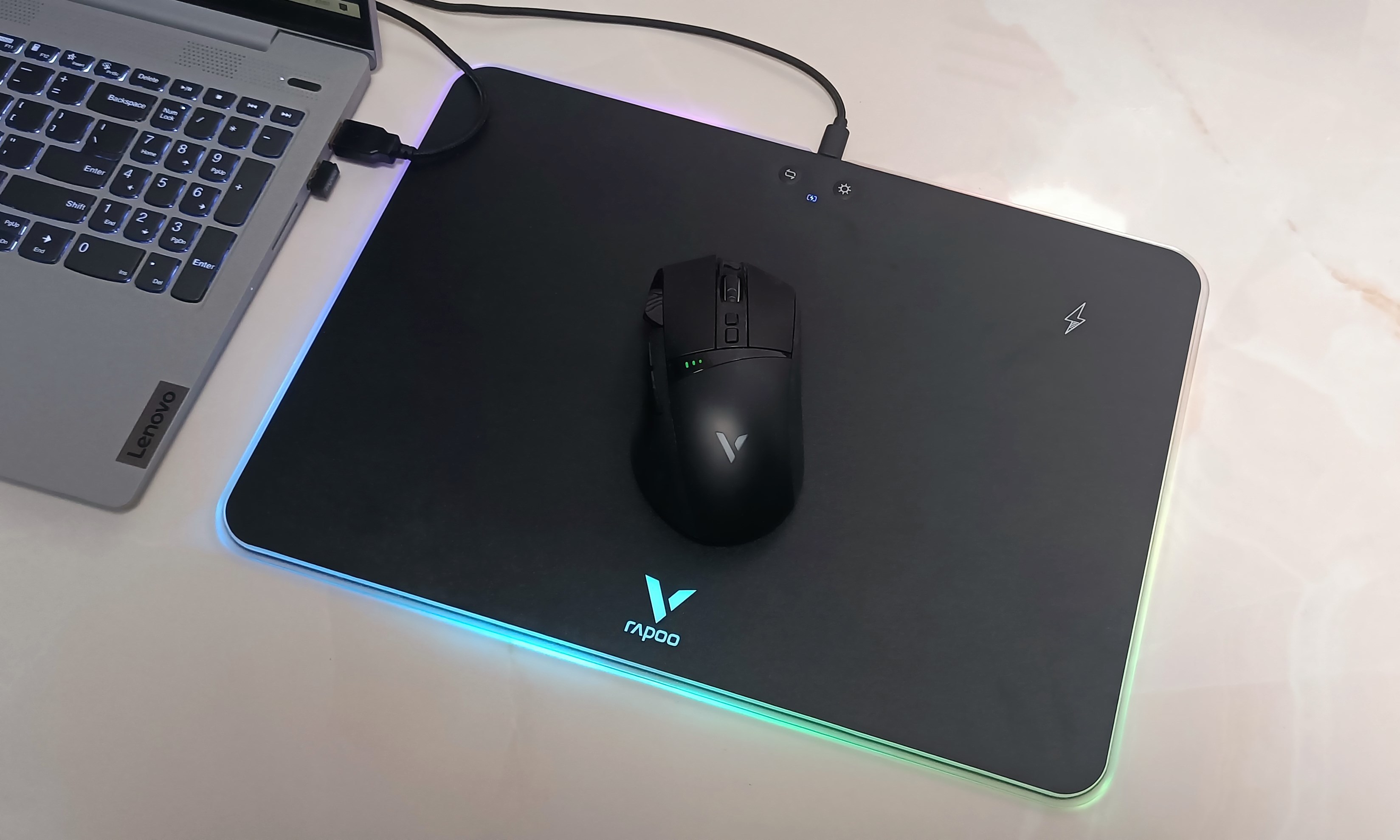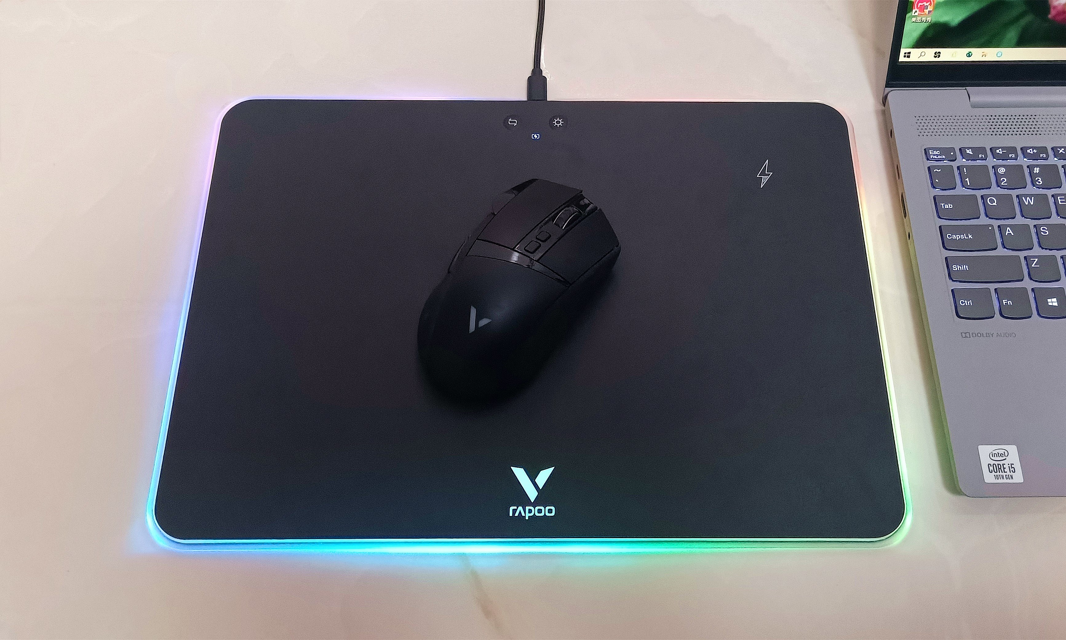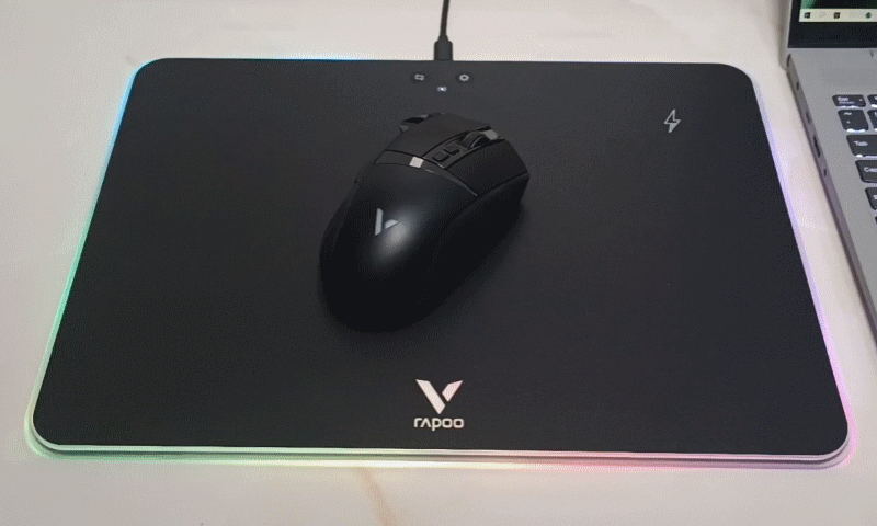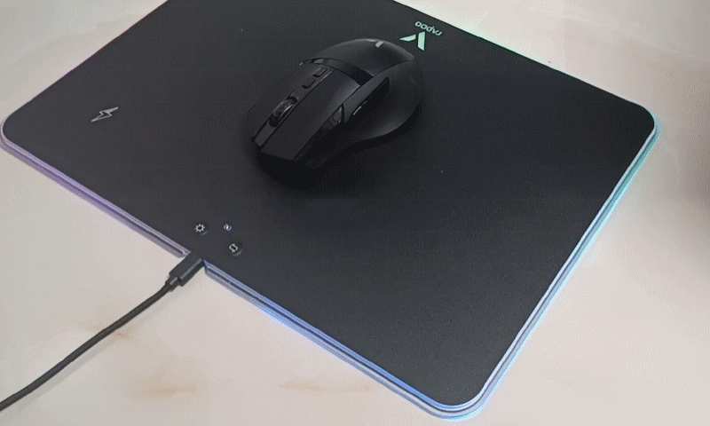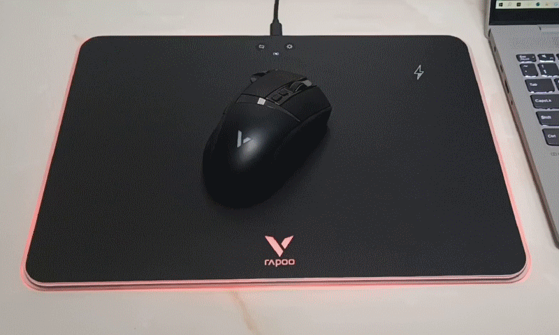 雷柏V10RGB是一款带炫酷背光和无线充电功能的鼠标硬垫,尺寸约为352*255*6mm,重约542克;面板上设置了2个物理按键,可实现灯光亮度四档调节和4种灯光模式的切换;支持无线充电,同时配有充电指示灯,可通过灯光颜色指示充电状态。