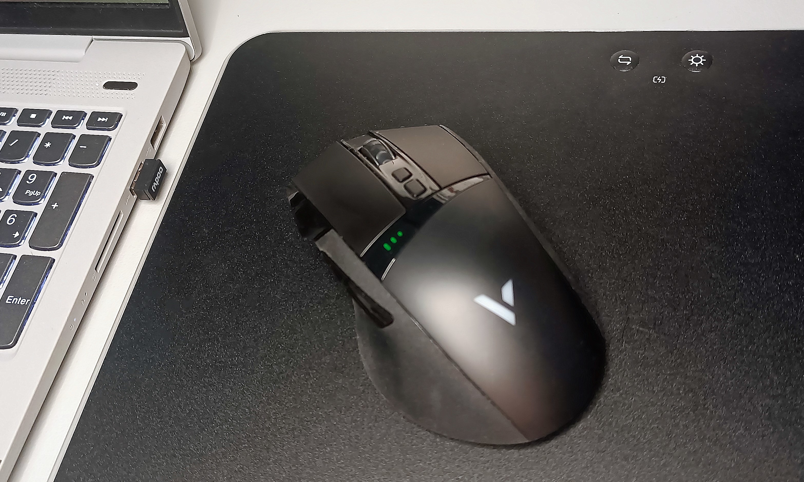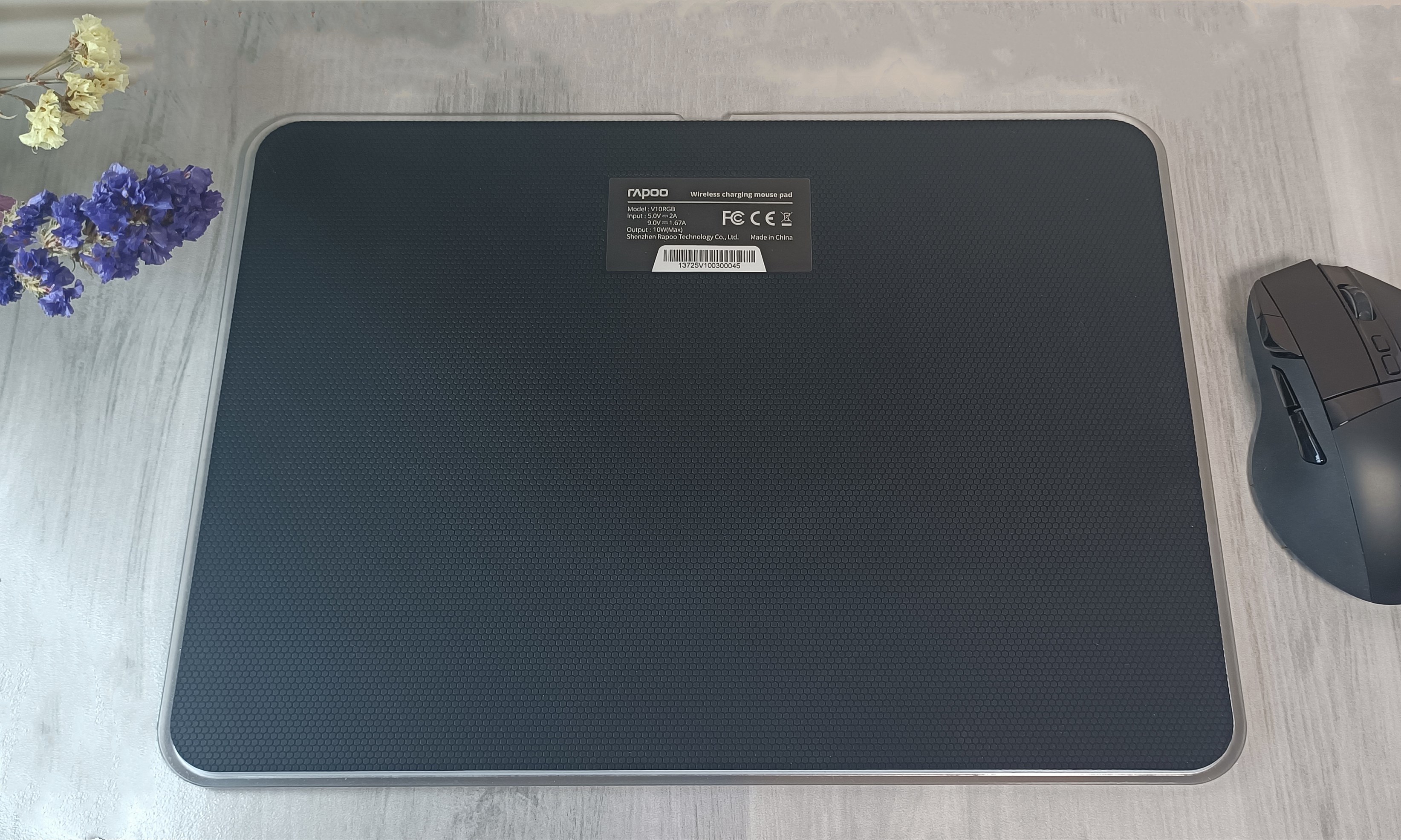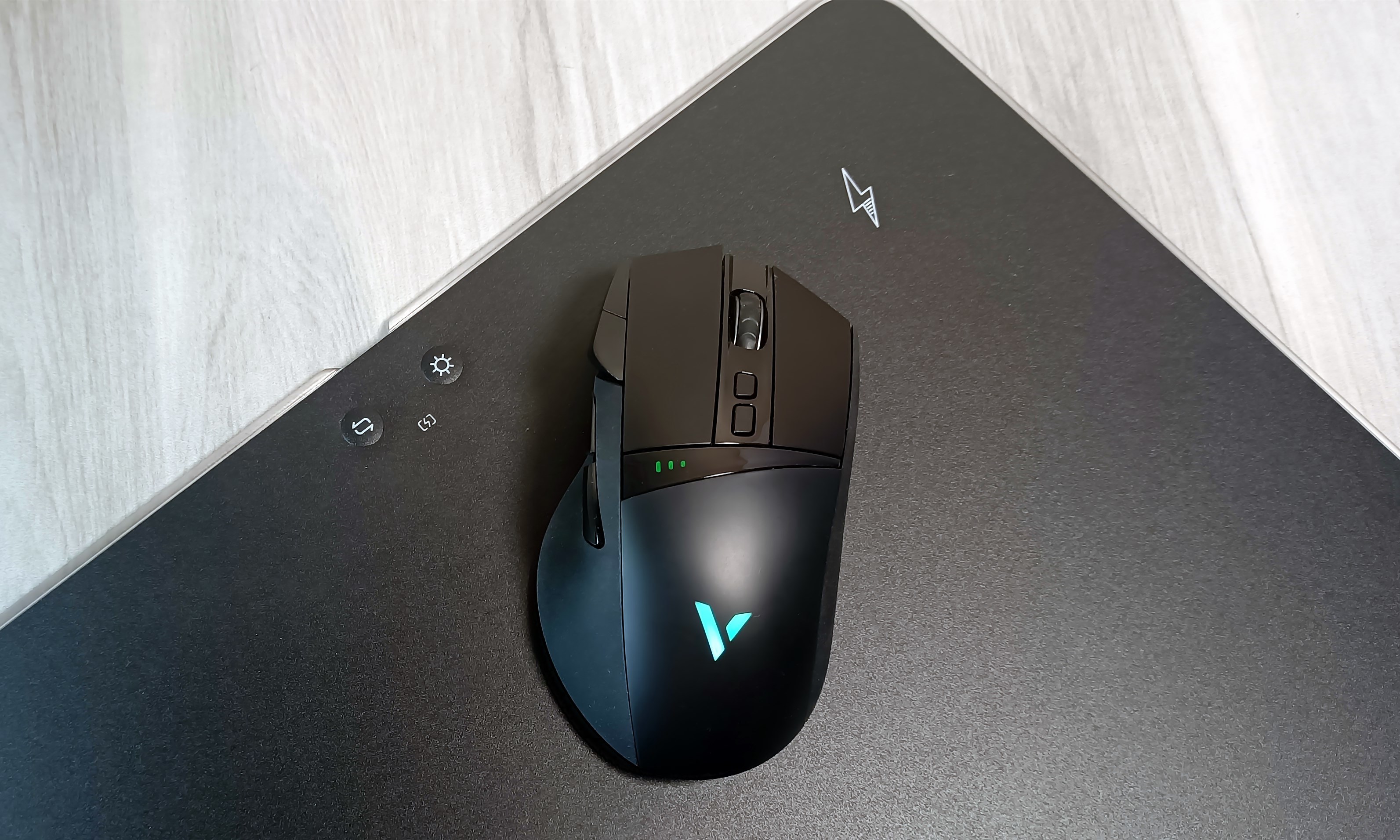 雷柏V10RGB是一款带炫酷背光和无线充电功能的鼠标硬垫,尺寸约为352*255*6mm,重约542克;面板上设置了2个物理按键,可实现灯光亮度四档调节和4种灯光模式的切换;支持无线充电,同时配有充电指示灯,可通过灯光颜色指示充电状态。