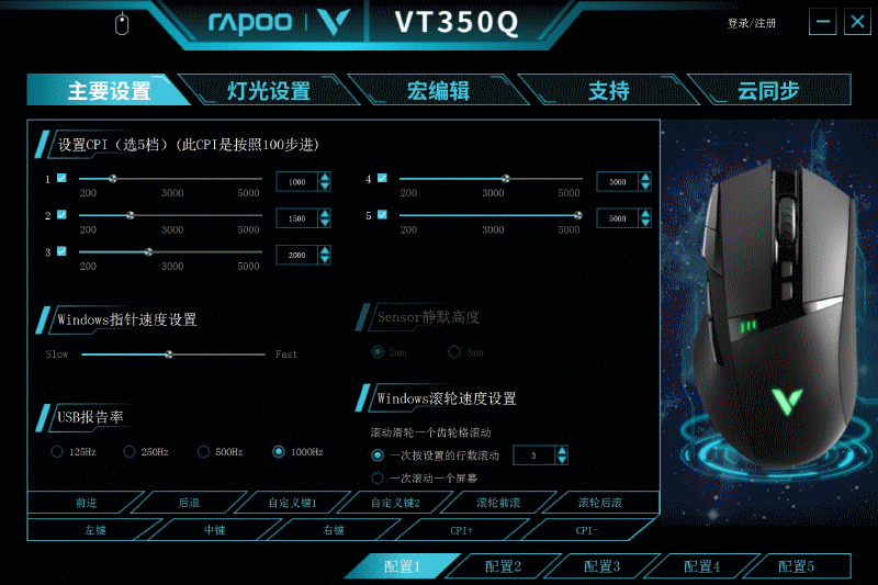 VT350Q鼠标的强大性能还体现在其丰富的定制功能方面。从雷柏官网下载VT350Q的专属驱动后,在主要设置页面可对鼠标的DPI档位初始值、指针速度、滚轮速度、USB报告率进行设置;在灯光设置页面可对背光效果、切换速度、灯光亮度、灯光颜色进行定制化;在宏编辑页面可对11键分别进行宏录制,实现游戏中的一键连招,非常实用。