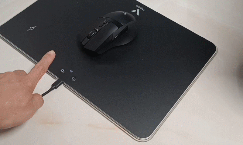 插入电源线后,鼠标垫正前方的充电指示灯会自动点亮,灯光颜色为蓝色;当鼠标置于无线充电区域充电时,指示灯颜色会转为红色;充满电后,变成绿色。