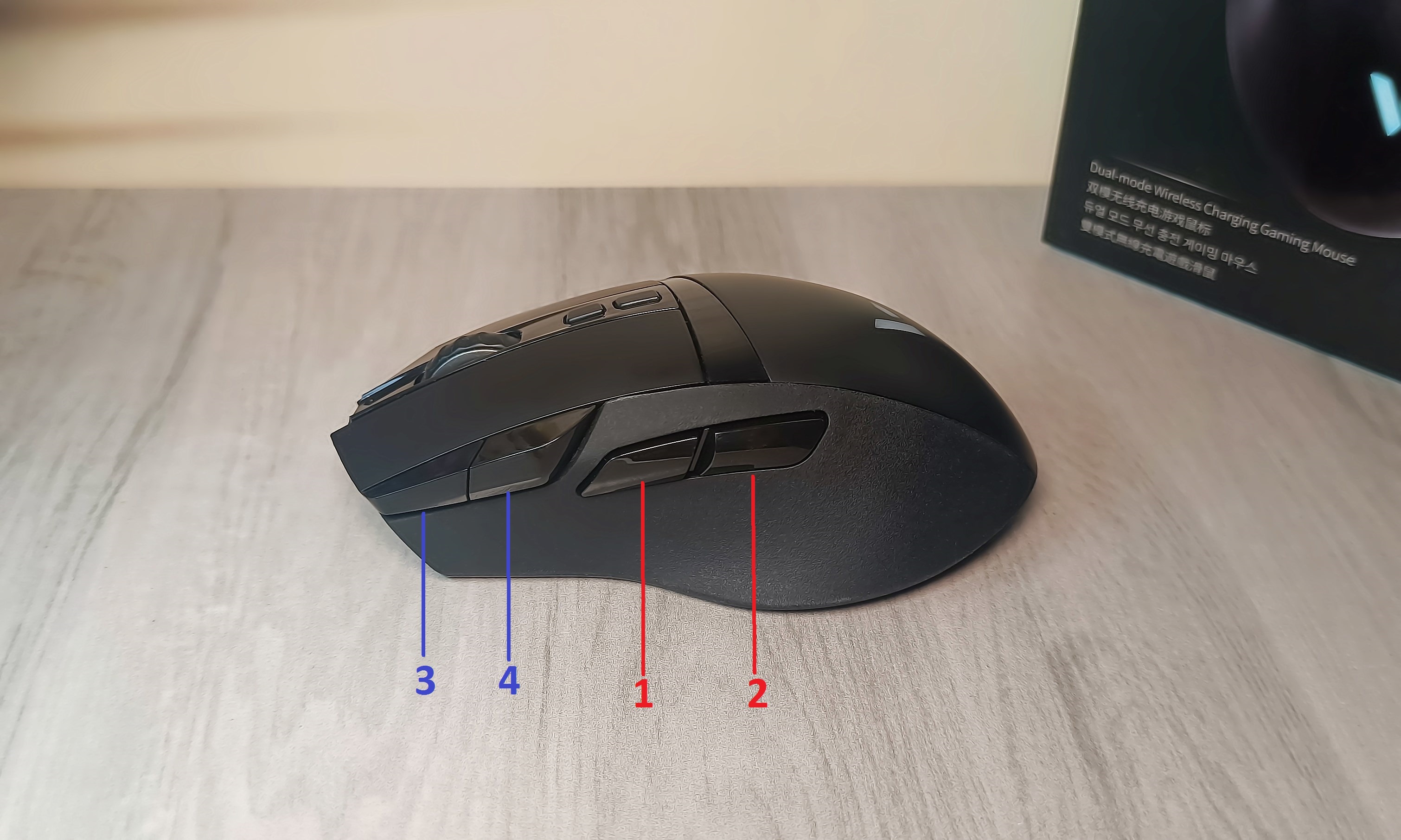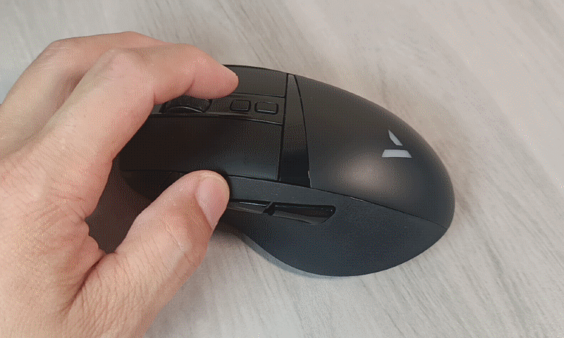 鼠标为右手专用设计,左侧边位置特别设计了2组共4个功能键,其中右手姆指位置的两个按键分别为自定义按键1/2,默认功能为前进与后退;靠前位置的两个按键分别为自定义按键3/4,默认功能为输入数字1和3。另外,自定义按键4,同时也是鼠标背光切换键。