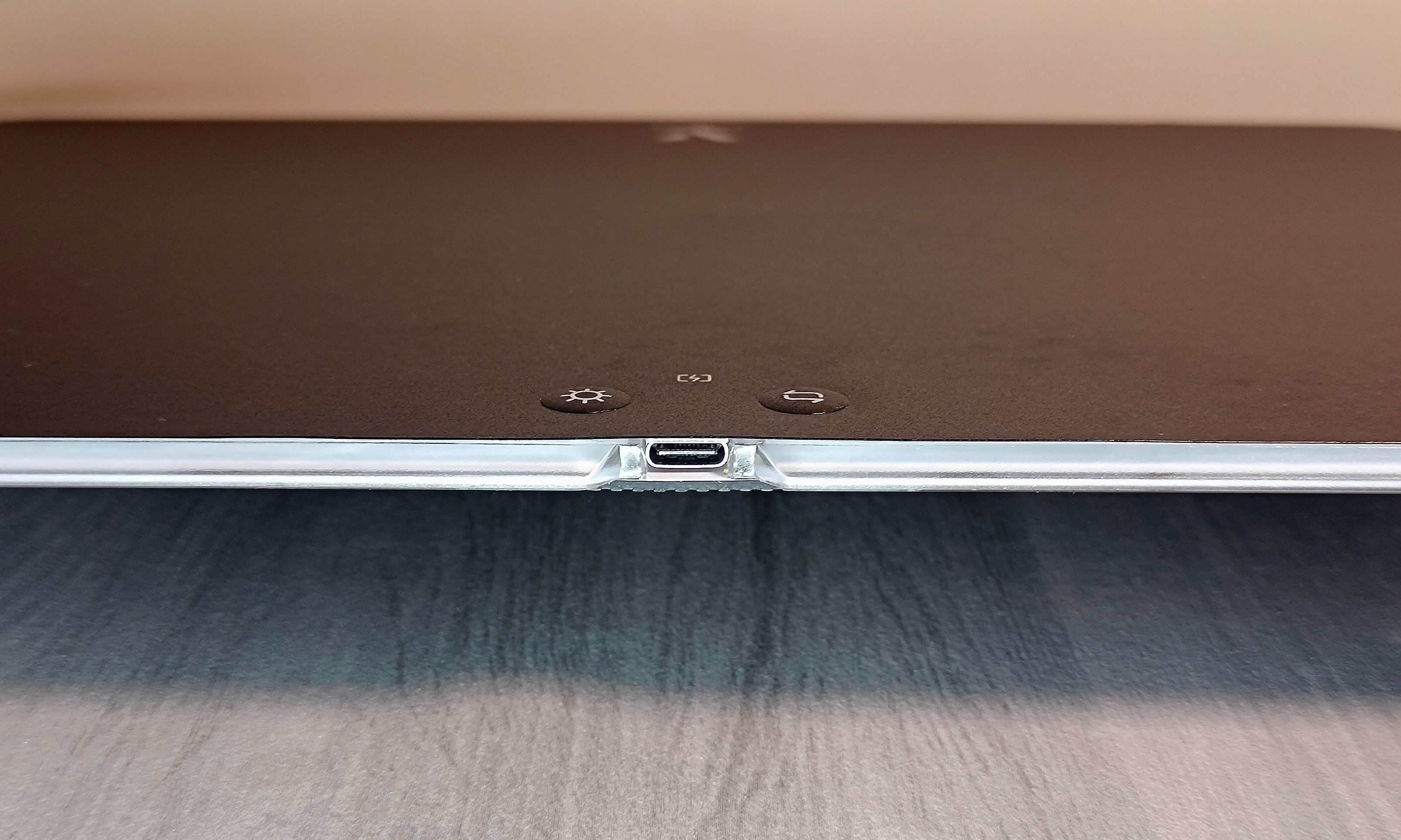 鼠标垫正前方有一个TYPE-C接口,它用来连接配送的TYPE-C电源线给鼠标垫供电,实现无线充电功能,同时还可能实现幻彩背光灯效的开启。