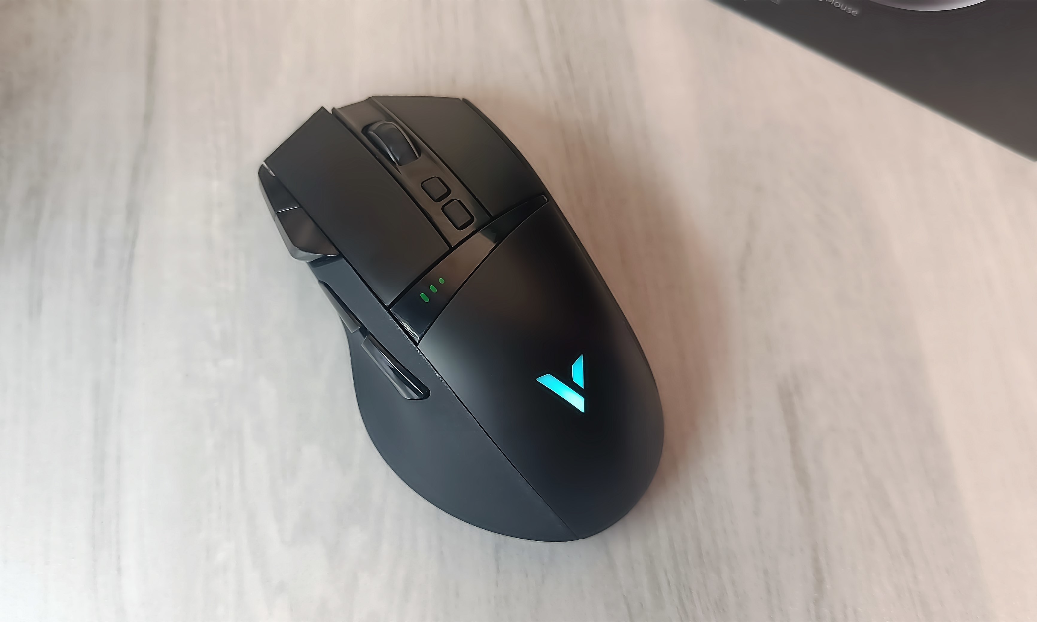 首先,先看一下鼠标。雷柏VT350Q是一款双模无线充电游戏鼠标,外观为纯黑色,尺寸约为127*68*42mm,重约120克,配有11个可编程按键;中大手型右手人体工学设计,DPI五档手动调节,支持无线/有线两种连接模式,内置800mAh锂电池,支持无线充电,尾部LOGO为1680万色RGB背光系统。