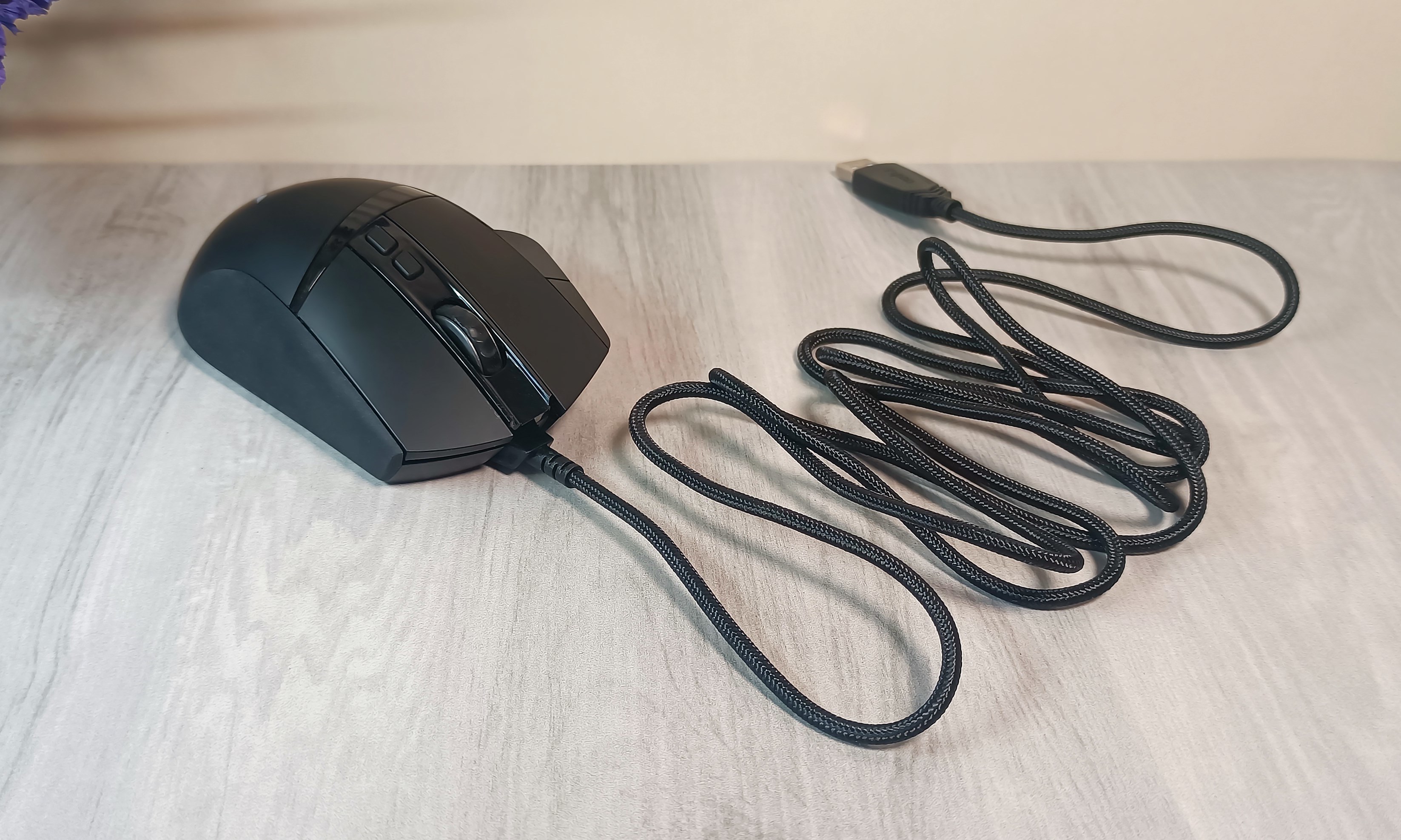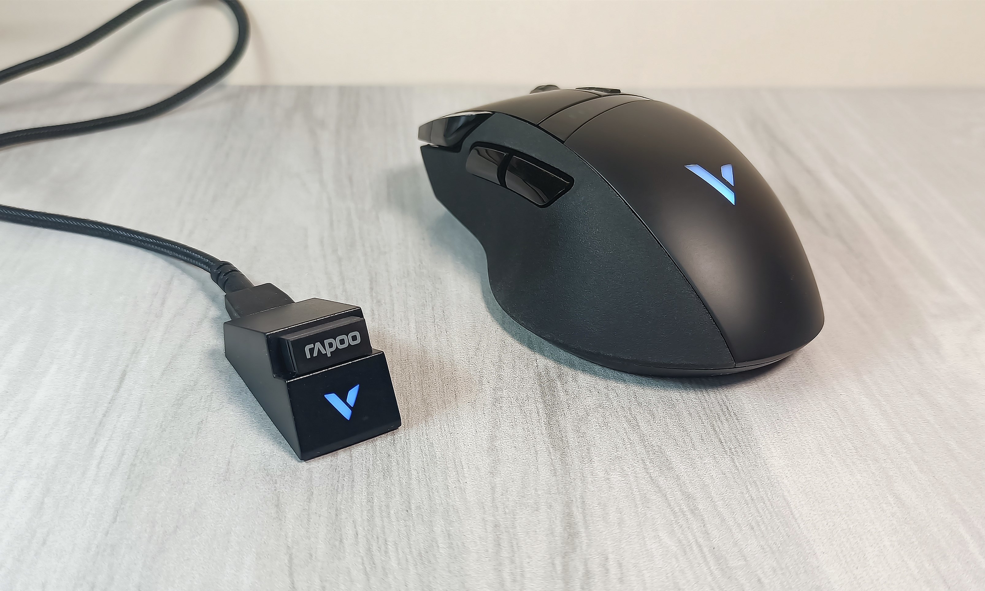 雷柏VT350Q无线充电鼠标配有一根长约1.8米的数据线,采用的编织线外皮,抗拉耐拽,非常结实,而且不易打结;线缆一端为标准USB插头,外壳上印有RAPOO品牌LOGO,辨识度高;另一端为micro USB插头,如果改成TYPE-C插头的话,通用性更强,可与鼠标垫电源线混用。
