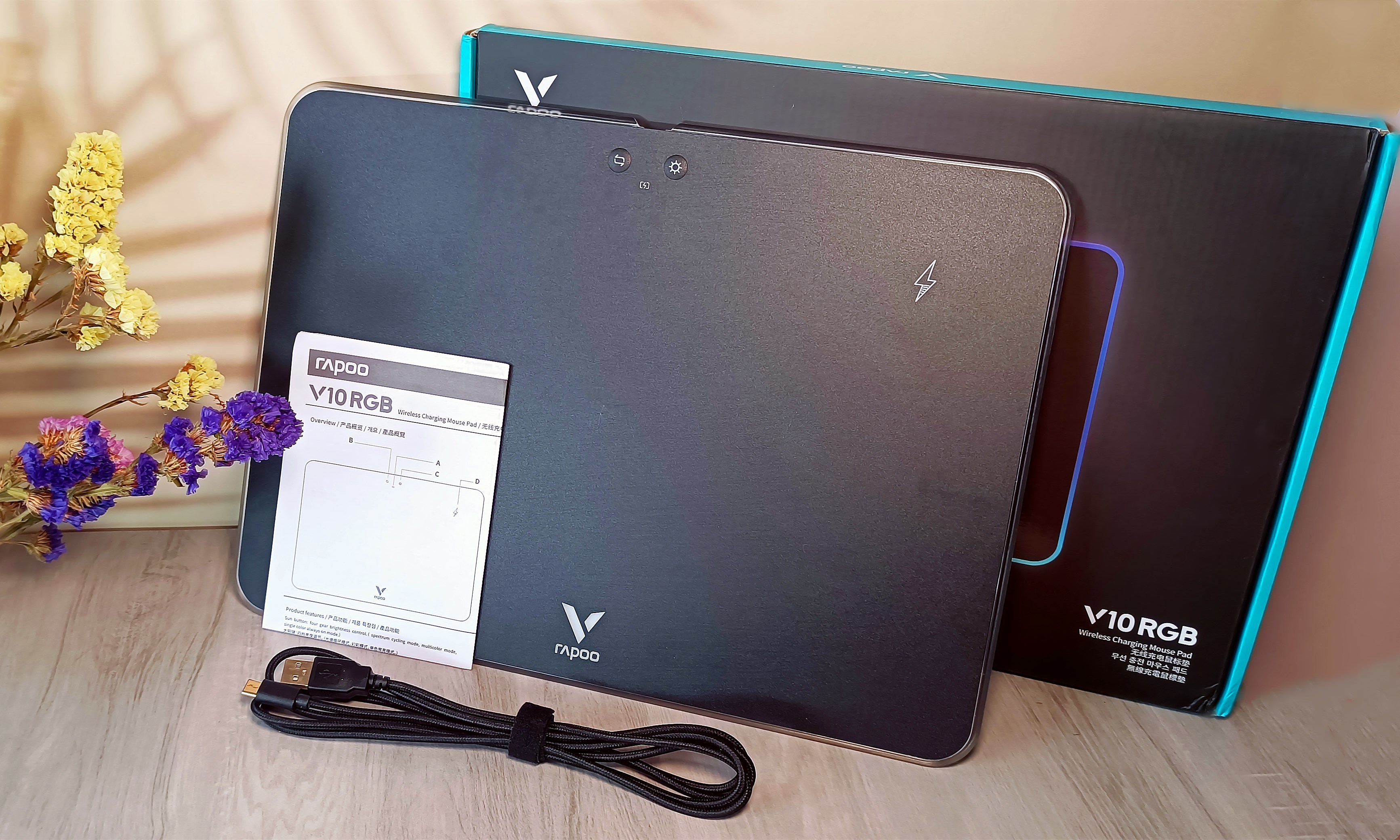 包装盒内共有3件物品,除了V10RGB鼠标垫外,还提供了1份折叠式产品使用说明书和1根TYPE-C规格电源线。