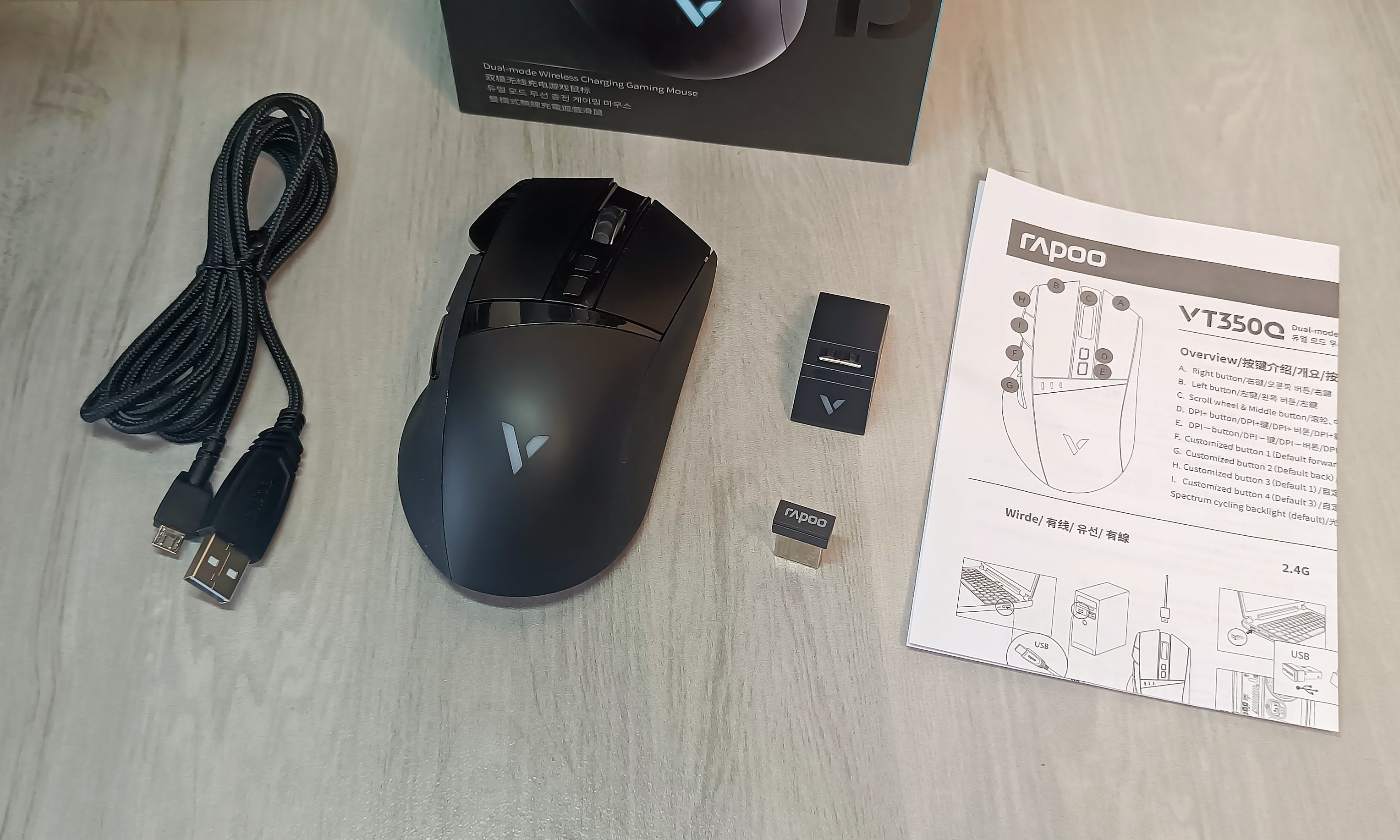 盒内商品比较齐全,除了VT350Q鼠标外,还提供了1份折叠式产品使用说明书,1根USB数据线,1个USB接收器,以及搭配USB接收器和数据线使用的USB母口-microUSB母口转换器。
