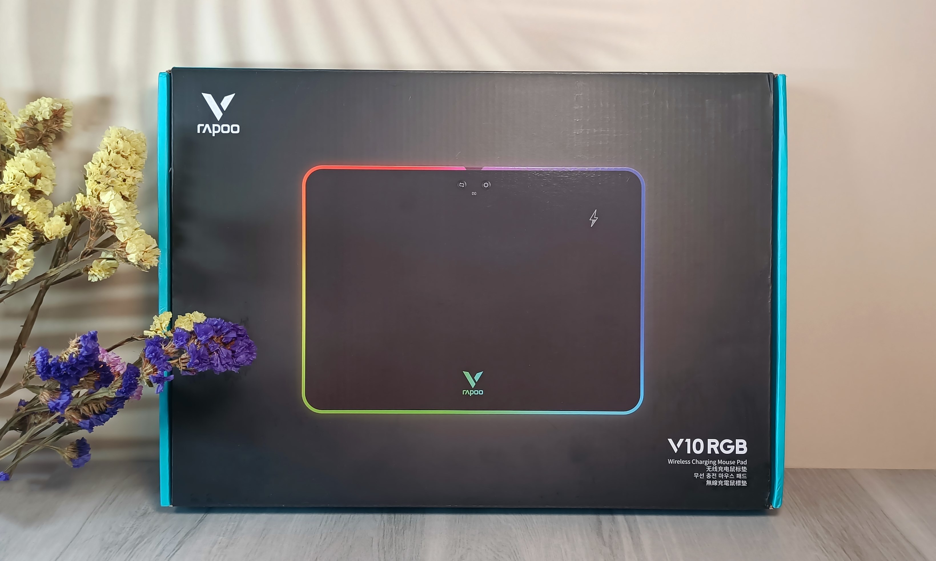 雷柏V10RGB鼠标垫的包装盒是一个扁平的纸盒,配色与元素设计均保持统一的家族风格。盒面正中是鼠标垫的高清实物图,彩灯与按键特征清晰明了;左上角是RAPOO的品牌LOGO,右下角是产品具体型号!