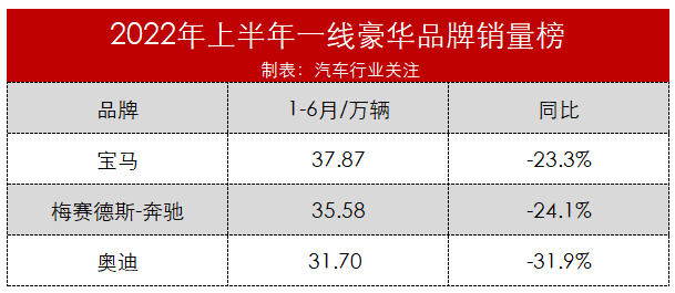 日前,一线豪华品牌奥迪、奔驰、宝马均已先后公布了2022上半年在华销量。据统计,上半年宝马以37.87万辆的销量领先奔驰和奥迪,成为国内豪华车市场销量领头羊,梅赛德斯-奔驰次之,奥迪垫底。